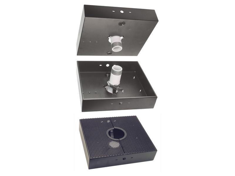 The PM-1T is a tray that mounts above a projector using a standard (1.5″ I.D.) round projector pole or any smaller round or rectangular pole. The tray accommodates up to two FP-PA20 Audio Power Amplifiers (for stereo operation) and two PS-24U2 Power Supplies. There is adequate space remaining for associated STICK-ON and TX series modules. If two FP-PA20 type amplifiers are not used, multiple STICK-ON, FLAT-PAK and TX series modules may be mounted. Examples of typical tray-mounted modules may include STICK-ON series power amplifiers. Headphone amplifiers, VCA modules, line amplifiers, video amplifiers or distribution amplifiers may also be mounted.