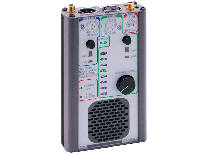The audio metering circuit features two inputs, an LED meter and a monitor speaker. The balanced input is front-panel switch selectable for MIC or LINE input (pro). The unbalanced input operates at -10 dBV (consumer). Either input may be used to feed the metering circuit. For balanced +4 dBu inputs, meter 0 dB = +4 dBu. For unbalanced inputs, meter 0 dB = -10 dBV. A front-panel volume knob controls the speaker level. The IN PHASE LED illuminates when the oscillator output and metering input are in phase (0 dB level or greater). The PT-AMG2 operates either from two internal 9 volt batteries or from an external 12 Vdc to 30 Vdc supply. Test leads and bench top support bracket are included. The balanced line levels (input and output) may be preset by the user to +4 dBu or +6 dBu.