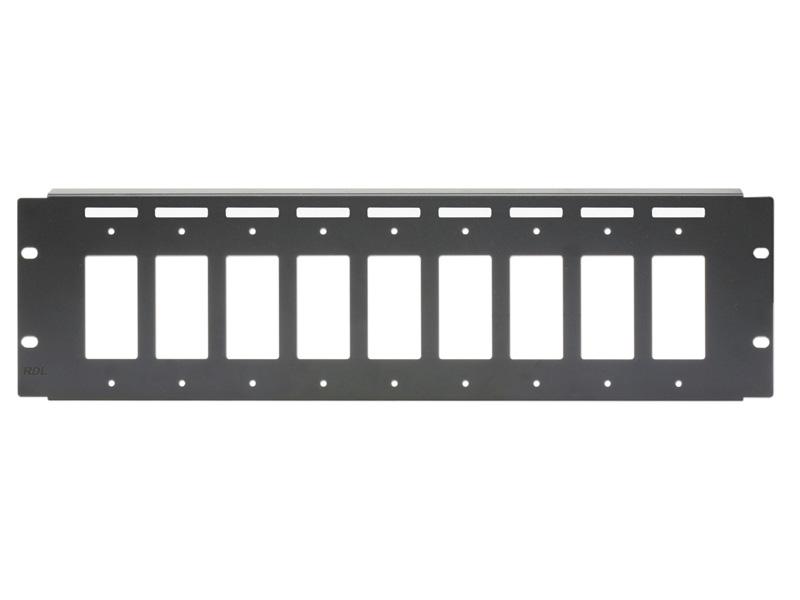 The RM-D9 is a 3 RU rack panel that allows the mounting of 9 Decora products, such as RDL remote controls and D-Series connector plates.