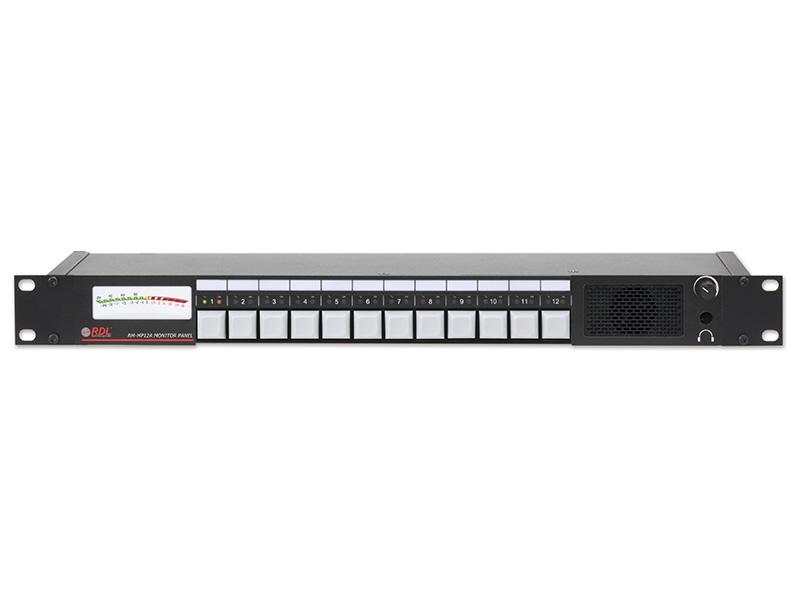 Each RM-MP12 input may be individually calibrated for unbalanced consumer, balanced professional, 8 Ohm speaker line or constant voltage speaker lines. There is a variable intensity LED on the front panel to show audio presence for each input. If the RM-MP12 is set to the interlocking operating mode, front-panel pushbuttons select one of the twelve inputs to feed the calibrated meter, front-panel speaker (or external speaker if connected) and headphone jack. In the mixing mode, the buttons allow the use to mix multiple sources. The front-panel volume knob controls the audio level of the front-panel headphone jack, front-panel speaker, external speaker output and variable line level (+4 dBu) rear-panel output. A separate fixed line-level output is provided.