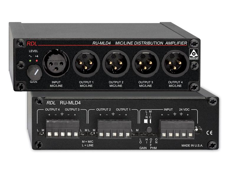 The RU-MLD4 is a four channel audio distribution amplifier. The input and all four outputs may be connected through the front-panel XLR jacks or on the rear panel detachable terminal blocks. The input accepts either a balanced microphone or line level signal. Each of the four outputs provides either a microphone or line level signal. Both the front-panel XLR connectors and the rear-panel terminals are active at all times. The RU-MLD4 may be rack-mounted with the XLR jacks facing forward, or may be reverse-mounted using the RDL RU-FP1 Filler Panel/Reverse Mount Kit.