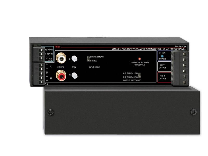 The RU-PA40D is equipped with an internal stereo VCA for setting the output level on both amplifier channels. A detachable terminal block provides for the connection of an external 10 KO potentiometer or a 0 to 10 Vdc control voltage. RDL remote controls are available to provide single-turn, multi-turn (rotary encoder) or pushbutton (ramp or fixed level selection) user level control. VCA control insures long term noise-free level adjustment. Remote control is possible using audio, control or common computer network wire.