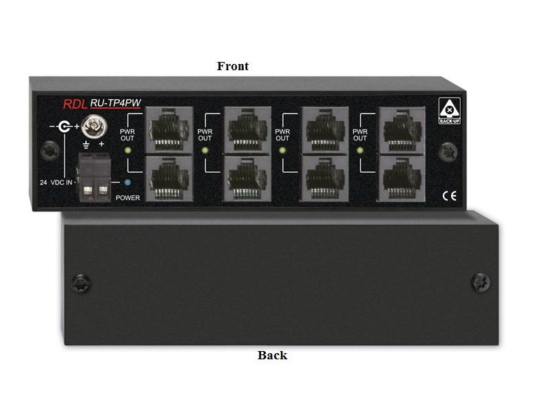 The RU-TP4PW is a four output power inserter compatible with RDL twisted pair products. The RU-TP4PW is powered from a 24 Vdc power supply using either the power jack or the detachable terminal block. Four dual-RJ45 jack sets are provided to connect remote twisted pair senders and receivers. Power is provided to all modules connected to the RJ45 jacks. Signal pairs feed through the associated RJ45s. The voltage feeding each dual-RJ45 jack set is separately protected by an automatically resetting fuse. A power LED is associated with each dual-RJ45 jack set, facilitating identification of wiring faults. Module power is indicated by a front-panel LED. The RU-TP4PW is ideal for powering remote twisted pair modules from a central equipment rack.