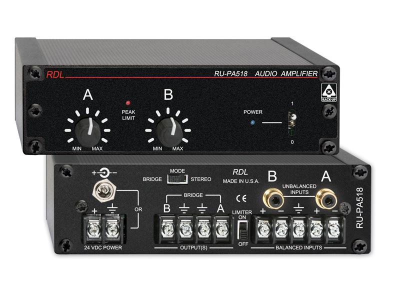 The RU-PA518 features two modes of operation: stereo and bridged mono. Depending on the mode of operation, the RU-PA518 can deliver from 5 to more than 18 watts of RMS power at the output. In stereo mode, each of the two inputs feeds its respective left or right output. Front-panel level controls set the gain for both left and right channels. When the rear-panel switch is set to the bridge mode, the two inputs (A and B) are mixed together and fed to the output. In either the stereo or mono mode, an internal audio peak limiter may be turned on using a rear panel switch.