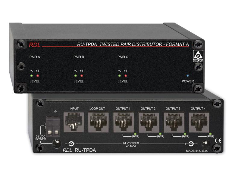 The RU-TPDA is a four output signal and power distributor module compatible with RDL Format-A twisted pair products. The INPUT RJ45 jack accepts a twisted pair cable originating from one or multiple FORMAT-A senders. The LOOP OUT connector permits the input signal to daisy-chain to additional distributor modules. The RU-TPDA input circuits bridge the cable pairs, allowing up to 10 distributors to be connected together to produce 40 distributed outputs. Further expansion is possible by using one distributor output to drive up to an additional 10 distributors.