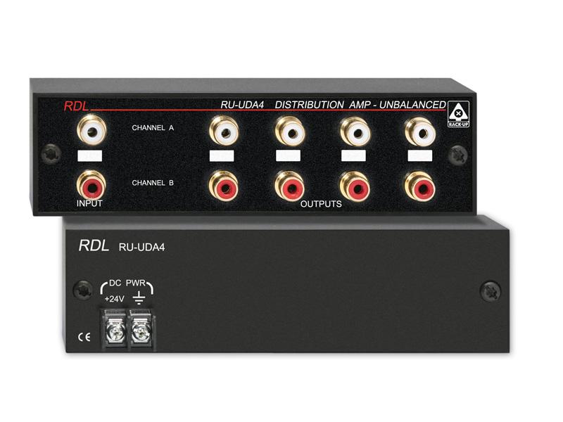 The RU-UDA4 is the optimum choice where connectorized, unbalanced line-level distribution is needed. This unit features two separate, isolated channels. The RU-UDA4 may be used in stereo applications, or as two individual monaural distribution amplifiers. The input signals are buffered through output line drivers, providing four separate line-level unbalanced outputs for each of the two inputs.