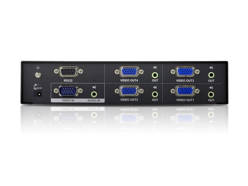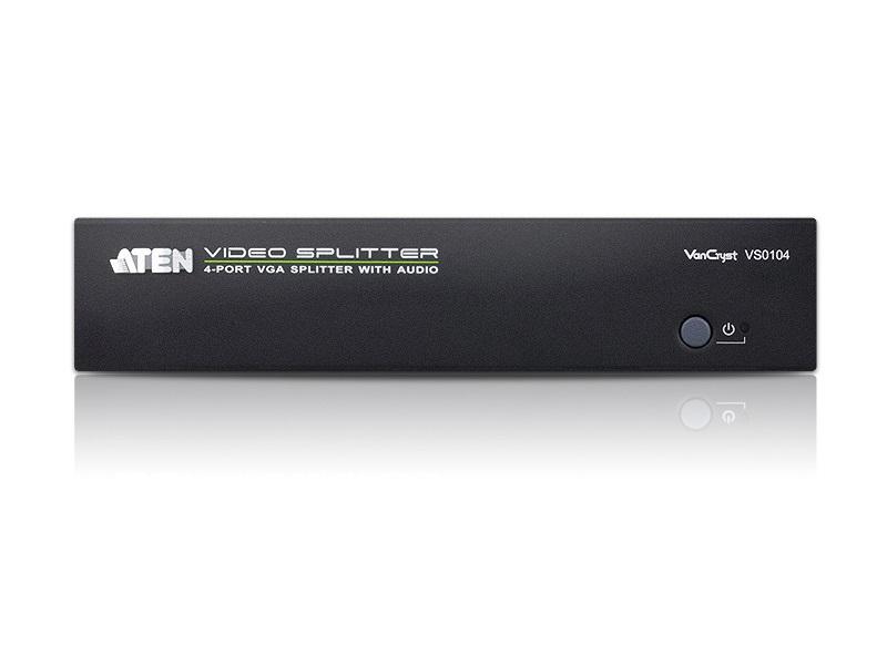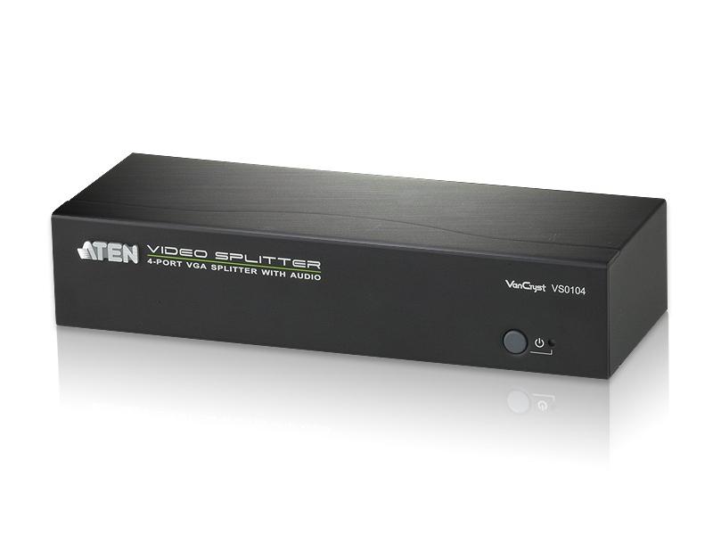 The ATEN VS0104 4-Port VGA Splitter with Audio is VGA splitter that allow a single VGA video & audio signal to be distributed to four output displays with independent stereo control. The splitter support up to 450MHz video bandwidth, which provides optimum video quality, supported by resolutions up to 1920×1440. Furthermore, for complete systems integration, serial control is standard through the VS0104 built-in RS-232 ports, which allow the splitter to be controlled through a high-end controller or PC. The VS0104 is perfect for conference rooms,training facility & multi-display broadcasting, with cascadable support up to three levels allowing a single video signal to be sent across up to 64 video displays while sustaining the highest quality possible.