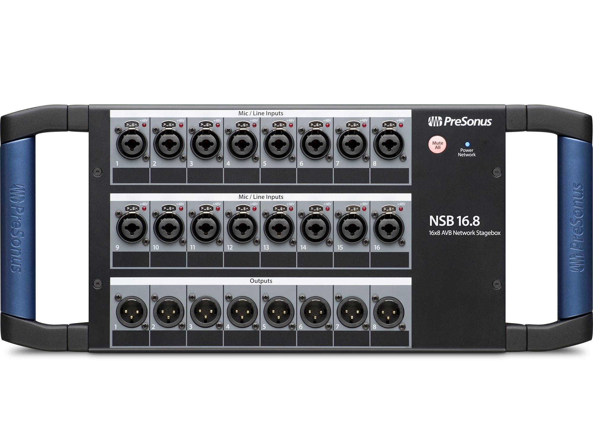 Designed to work seamlessly with PreSonus® StudioLive® Series III console/recorders the PreSonus NSB 16.8 is an 16-in, 8-out stage box that sets up quickly and easily to route signals from stage to mixer over an AVB network. With AVB networking, all signals flow through one lightweight CAT5e or CAT6 Ethernet cable, eliminating the need for a heavy, expensive copper snake—and the signal degradation that goes with long analog cable runs. You can even remote control the NSB 16.8’s inputs, preamps, and phantom power from your networked Series III console or from free PreSonus UC