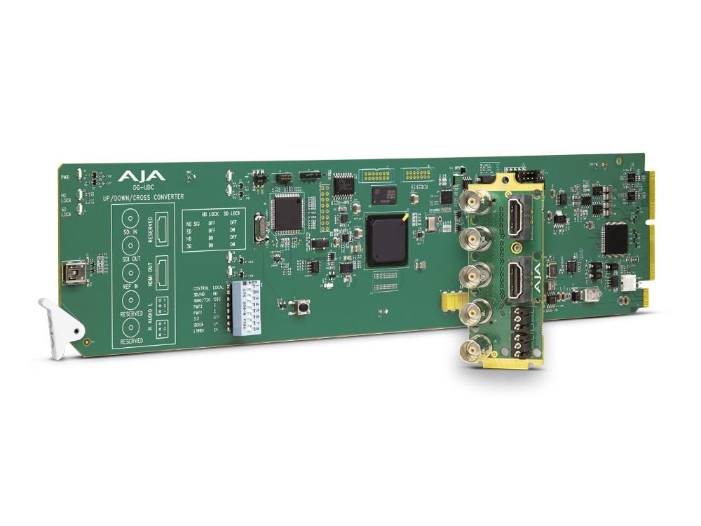OG-UDC is an openGear 10-bit broadcast quality up, down, cross-converter that bridges HD and SD video resolutions. The OG-UDC provides 3G-SDI input and output, HDMI output and two 3-pin terminal block connectors for analog audio Outputs.