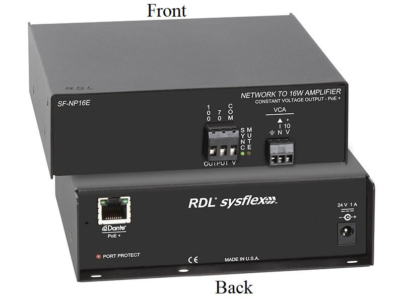 The SF-NP16E is equipped with an internal VCA for setting the output level. A detachable terminal block provides for the connection of an external 10 KΩ potentiometer or a 0 to 10 Vdc control voltage. The amplifier gain remains at maximum when the VCA input terminal is not connected. RDL remote controls are available to provide single-turn, multi-turn (rotary encoder) or pushbutton (ramp or fixed level selection) user level control. VCA control insures long term noise-free level adjustment.