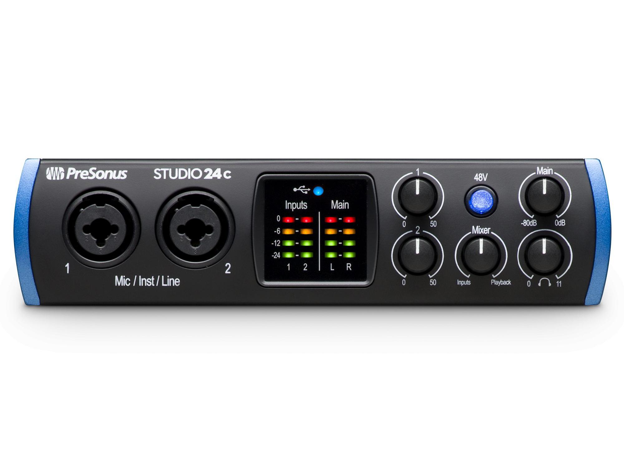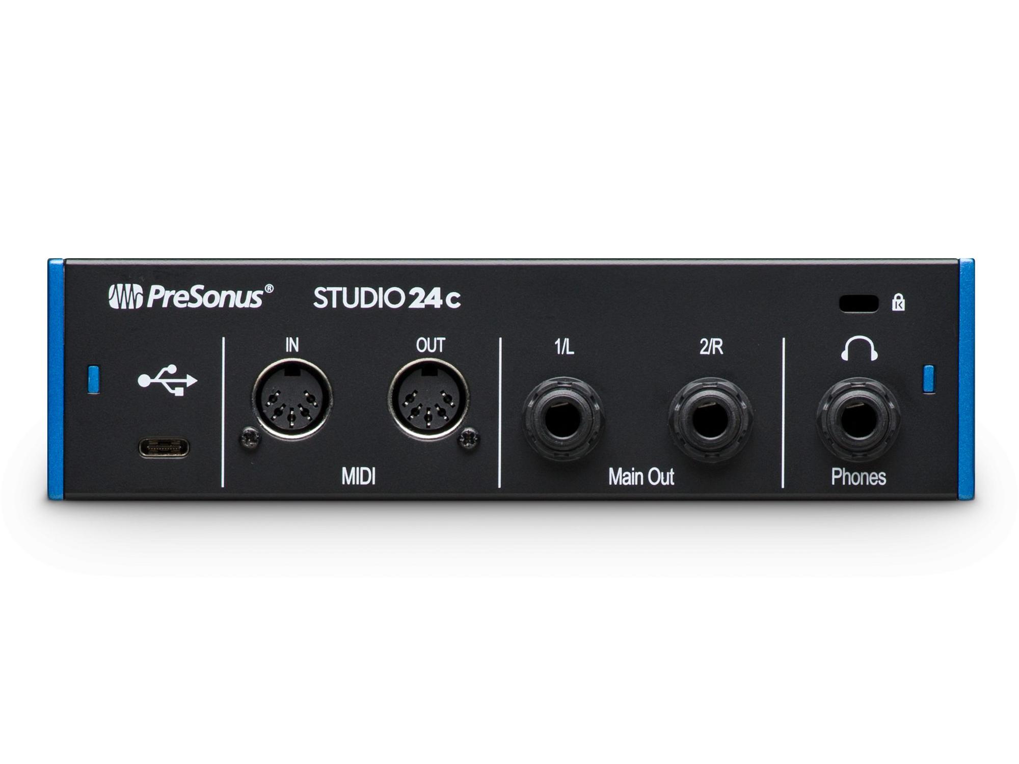 Great for recording studios, mobile musicians, guitarists, podcasters, and live streaming, the bus-powered Studio 24c 2-in, 2-out audio interface features 2 front-panel combo mic/line/instrument inputs with PreSonus® XMAX-L solid-state mic preamps, 2 rear-panel line outputs, MIDI I/O, and onboard direct monitoring control. A complete, all-in-one home recording studio, the Studio 24c comes with PreSonus’ award-winning Studio One® Artist music production software for macOS® and Windows®.