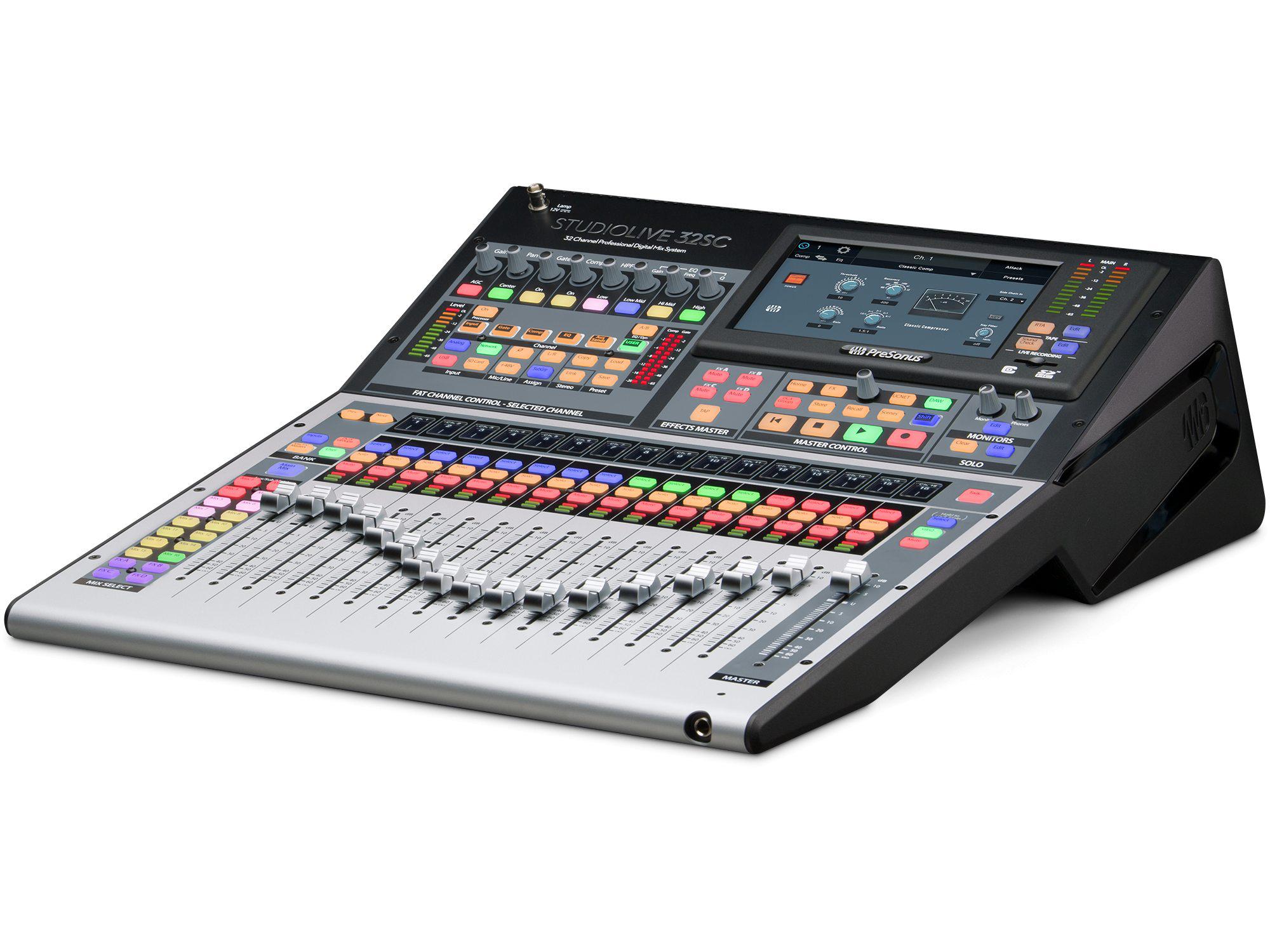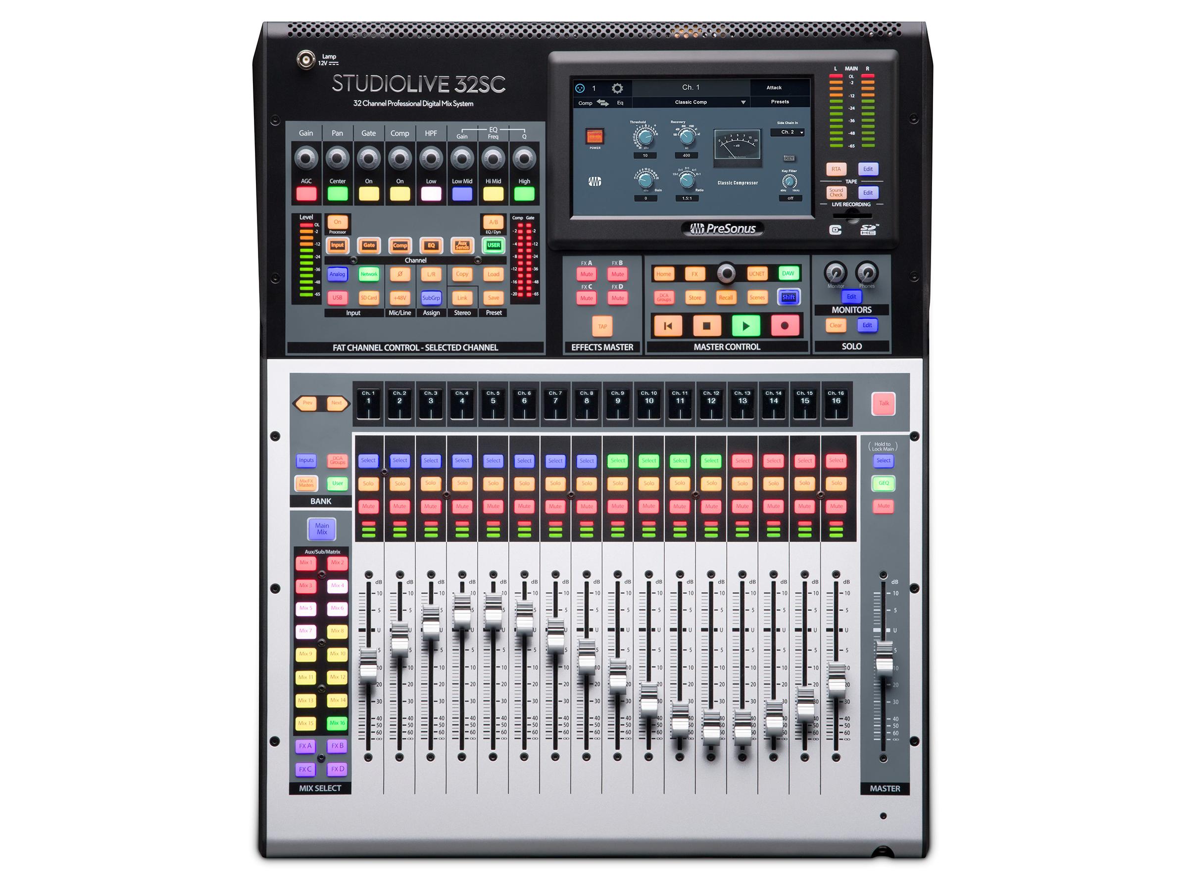 The StudioLive 32SC is a compact, rack-mountable 32-channel digital mixer that can be quickly and easily scaled for 16-, 24-, and 32-channel applications. Don’t let the road-ready size fool you; the StudioLive 32SC sports a dual-core PreSonus FLEX DSP Engine powering 40 mixing channels, 26 mix buses, and 286 simultaneous processors—including 4 stereo reverberation systems and Fat Channel plug-in models on every input channel and mix bus. With 128 (64×64) channels of USB recording and AVB network audio I/O, flexible routing options, and studio-grade audio quality, the StudioLive 32SC provides all the tools you need—whether you’re building your dream studio or putting together a pro touring rig.