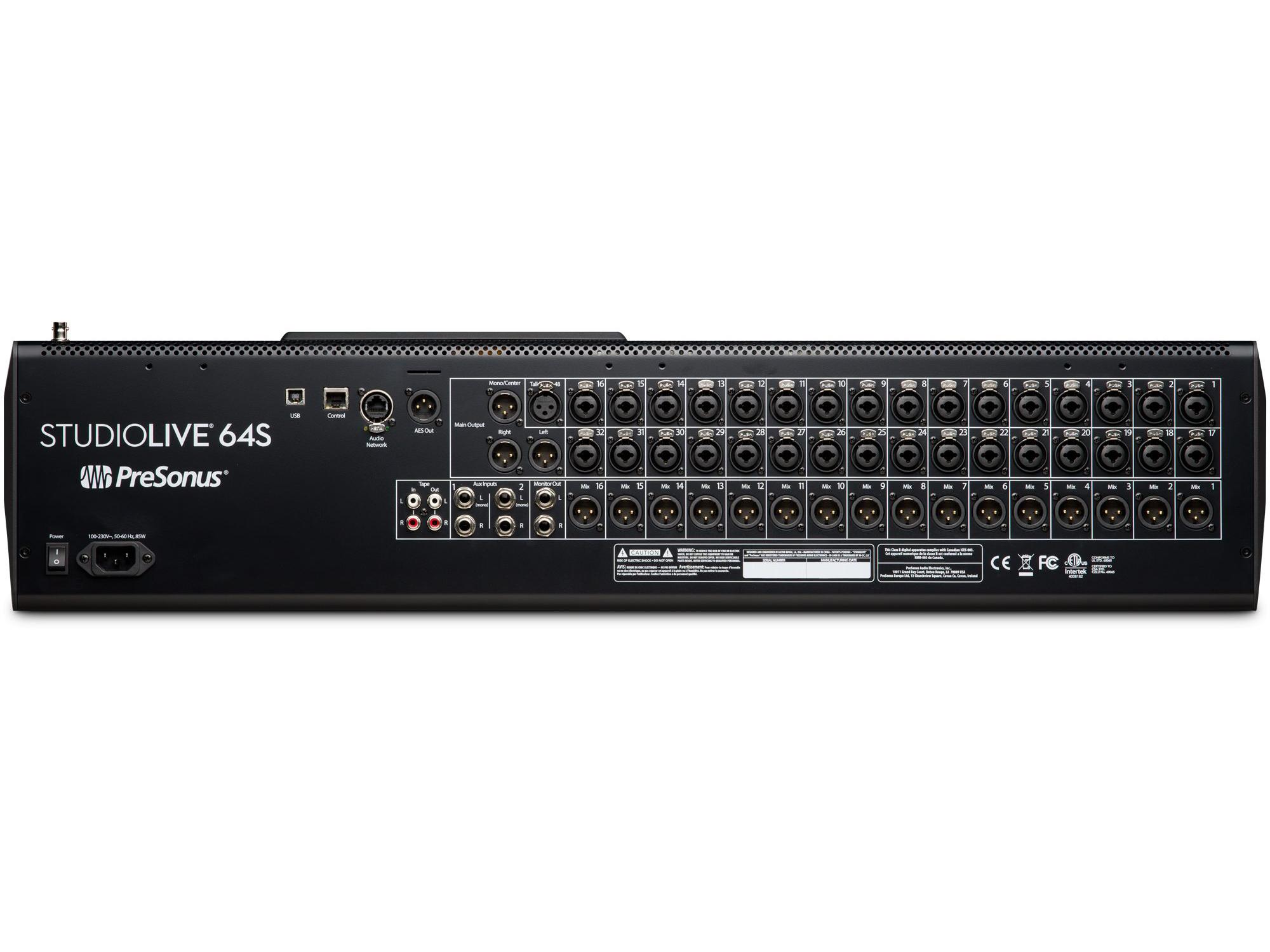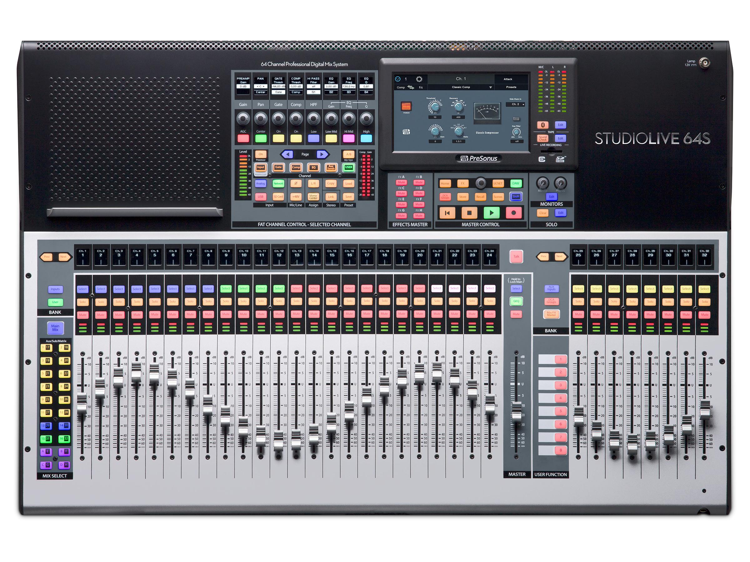 The StudioLive 64S is a 64-channel mixer that brings the power of a large format console to small format digital mixing. Powered by the new quad-core PreSonus FLEX DSP Engine, the StudioLive 64S digital mixer is equipped with 76 mixing channels, 43 mix buses, and 526 simultaneous processors—including 8 stereo reverberation systems, and Fat Channel plug-in models on every input channel and mix bus. With 128 (64X64) channels of USB recording, 128 channels of AVB I/O, flexible routing options, and the studio-grade audio quality that made StudioLive mixers famous, the StudioLive 64S delivers a truly exceptional mixing experience that’s in a class of its own.