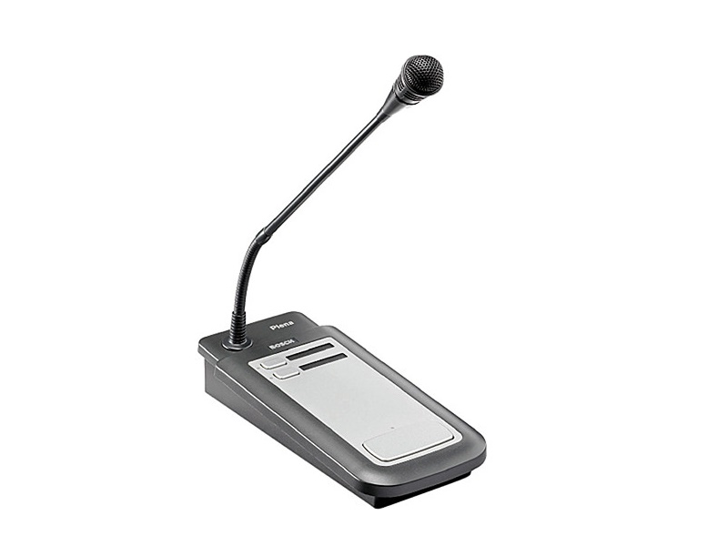 The PLE-2CS 2-Zone Call Station Plena Tabletop Paging Microphone from Bosch is a high-quality unidirectional condenser microphone that lets you make calls to selected zones in a public address system that has been built with PLE-series 2-zone mixers and mixer amplifiers. The mic has a heavy metal base with rubber feet for stability on any flat surface. The unique body design also allows the mic to be flush-mounted in a desktop. The flexible mic stem allows precise positioning.