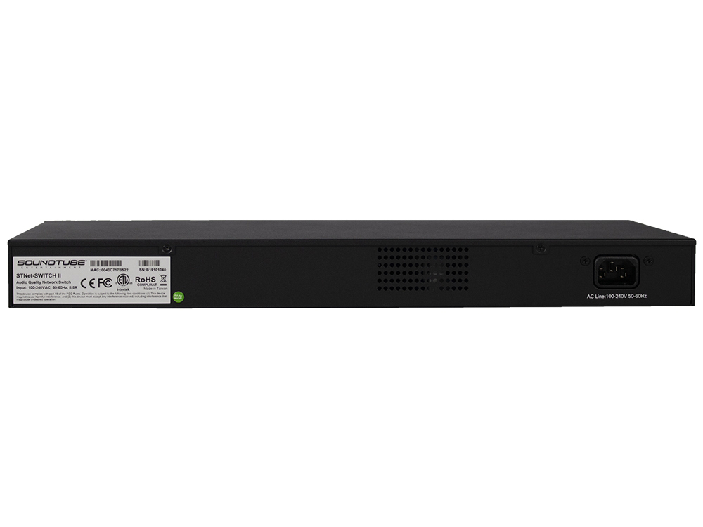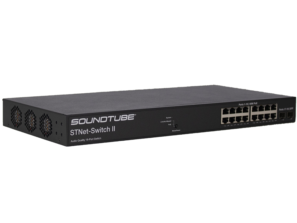 Rack mountable 16-port 40w PoE audio quality switch designed for use in Dante Networks. In addition to the 16 Ethernet ports, the STNet-Switch II includes two SFP ports that can be adapted to fiber or high speed Ethernet connections. The two SFP ports can be turned into a high speed optical fiber ports or copper Ethernet ports with the addition of a Gigabit SFP transceiver module.