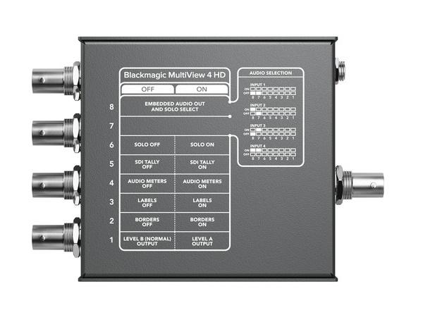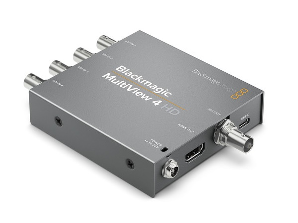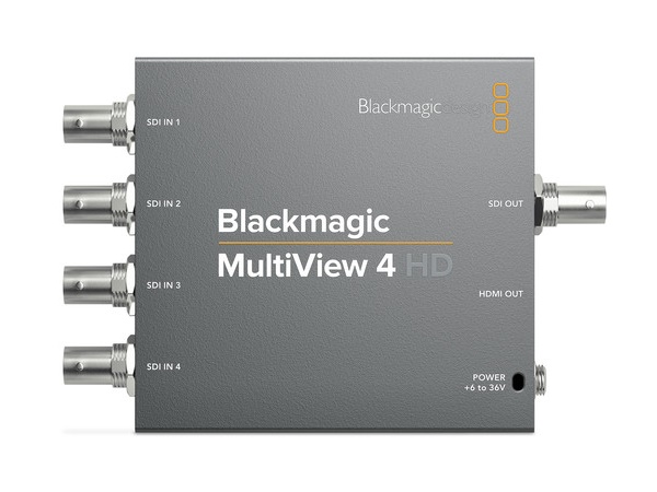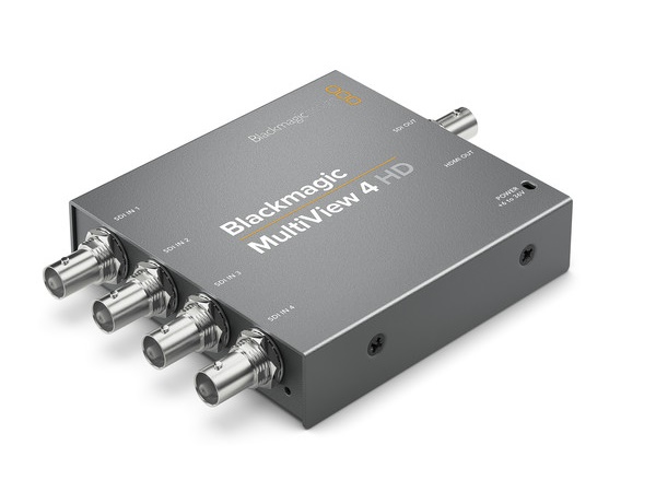 Blackmagic MultiView 4 HD is a multiviewer that lets you simultaneously monitor 4 completely independent SDI video sources on a single display! You can monitor any combination of SD and HD formats and frame rates, all at the same time. Each view can display overlays with information such as custom labels, audio meters and more. MultiView 4 HD has both SDI and HDMI outputs for monitoring on professional SDI displays, projectors or even big screen televisions!
