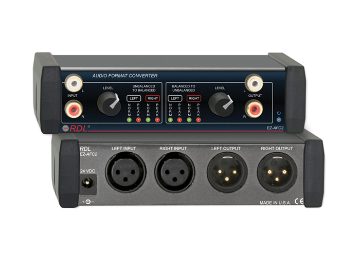 The EZ-AFC2X is a compact stereo bi-directional audio converter that converts unbalanced consumer-level signals to professional balanced outputs and balanced signals to unbalanced outputs. It is designed to bridge consumer and professional audio equipment with precise level control and reliable metering. The unit offers front-panel access and rackable mounting in a 1/3 rack width form factor for tight installations.