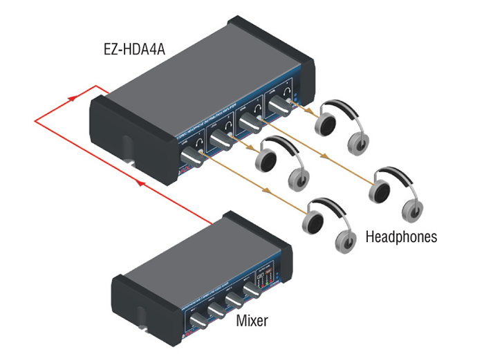 Typical applications include studio monitoring stations, retail listening demos, worship audio distribution, and museum or exhibit audio systems where multiple listeners require individual volume control. The EZ-HDA4AX is also suited to home component systems and commercial installations where a compact, dedicated headphone distribution solution is required. It is engineered to integrate into racks or small console spaces using its 1/3-rack width enclosure.