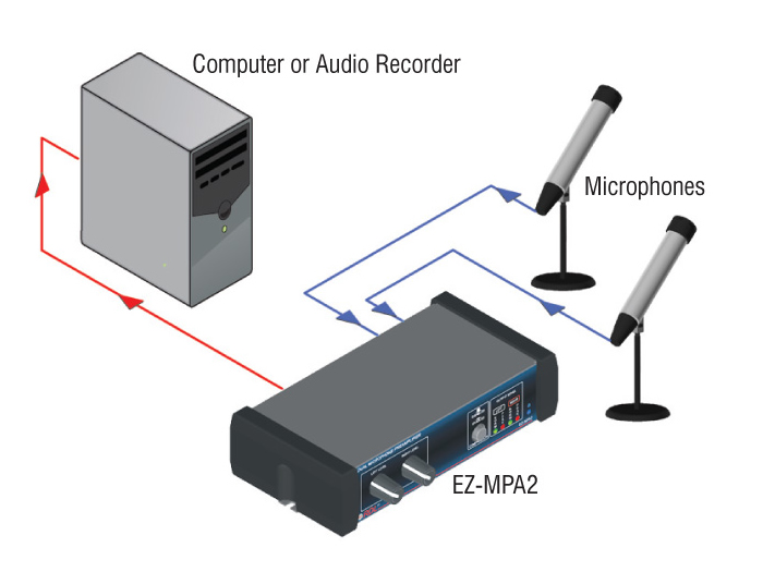 The EZ-MPA2X is a compact dual microphone preamplifier designed to convert two mic-level signals to stereo line-level outputs. It provides front-panel level controls and dual-LED VU meters for visual monitoring of each channel. The unit is optimized for both dynamic and condenser microphones and offers switch-selectable phantom power on the rear panel.