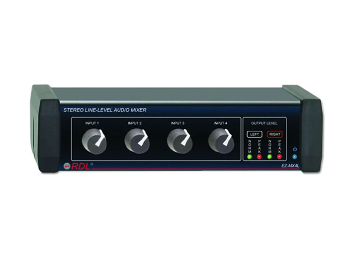 The EZ-MX4LX is a compact stereo line-level audio mixer designed to combine up to four stereo sources into a single stereo output. It provides front-panel level controls and left/right LED VU metering to simplify level matching and maintain optimal headroom. The mixer accepts both RCA and 3.5 mm mini-jack inputs for flexible connection to consumer and pro audio devices.