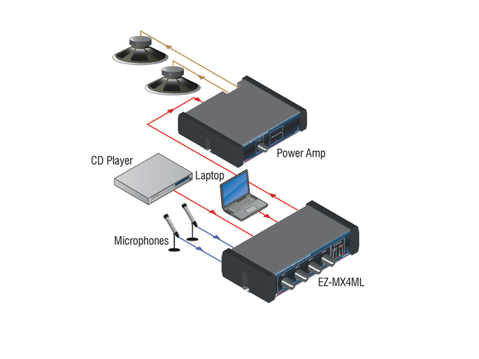 The EZ-MX4MLX is suitable for houses of worship, small studios, restaurants, clubs, meeting rooms, broadcast and commercial sound systems where compact, reliable mixing of microphones and line sources is required. It supports both dynamic and condenser microphones and accommodates high input levels while maintaining low noise and minimal crosstalk. The unit’s headroom characteristics help preserve transient detail and prevent clipping when signals are hot.