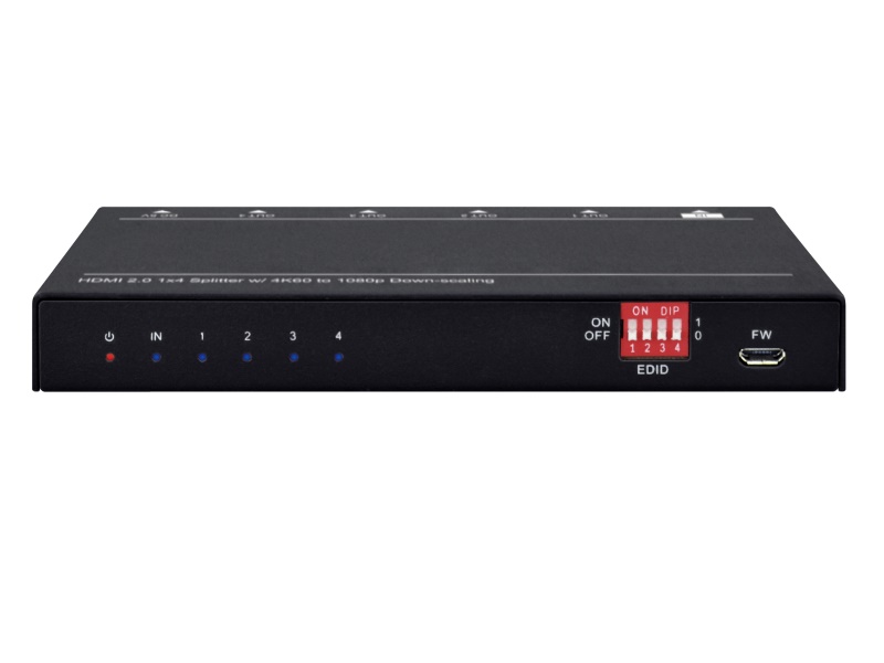 The DXE-142A-DS 1×4 HDMI 2.0A 4K Splitter with Auto EDID Management provides one of the most advanced HDMI splitter solutions by which the Ultra High Definition video and high quality audio can be transmitted to multiple locations without losing quality. The DXE-142A-DS supports all 3D formats and true 4K2K video. EDID management can be one of the most important capabilities to a splitter. Taking it one step further Aurora has added the ability to customize EDID for complete EDID emulation. This allows full control over the source and what it will be allowed to do. The DXE splitter have firmware upgrade capability via the USB port ensures compatibility now and in the future. With 48bit deep color video and high definition audio support, the DXE-142A-DS is suitable for high quality HDMI broadcasting, conference room, digital signage and education applications.