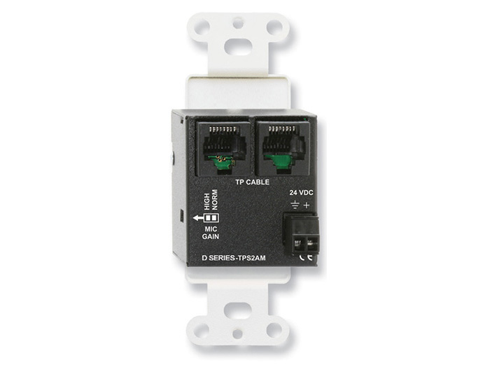 APPLICATION: The D SERIES-TPS2AM modules features an XLR microphone input and a stereo Mini-jack input summed to mono. The unbalanced Mini-jack inputs are designed to receive standard -10 dBV consumer level signals. The microphone input provides 24 Vdc IEC phantom voltage and accepts both dynamic and condenser microphone signals. The input signals are amplified using studio-quality preamplifiers optimized for normal operating levels. A rear-panel GAIN switch is provided to set the amplification of the microphone preamplifier. This switch is normally set by the installer for NORM (normal) gain. If consistently low mic levels are expected, this switch may be set to the HIGH gain position. The pre-amplified microphone source is routed to pair A. The buffered Mini-jack input is routed to output cable pair B.