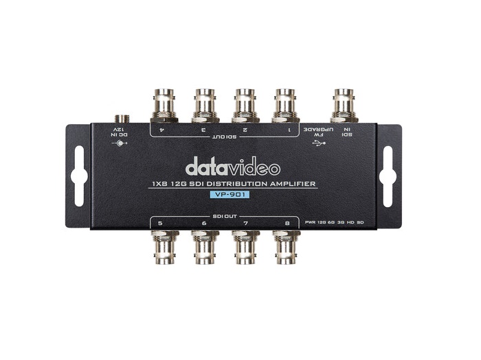 The Datavideo VP-901 is a 4K-compatible Distribution Amplifier supporting up to 12G/6G/3G/HD/SD-SDI video signals, it allows one source to be distributed and amplified up to eight outputs to multiple devices such as switchers, recorders and monitors.