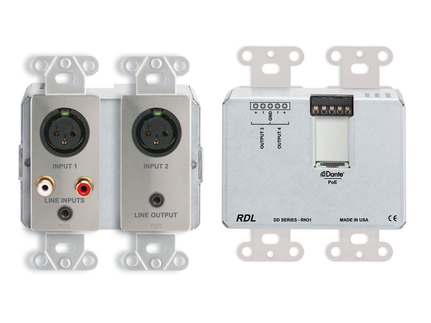 The DDS-RN31 is a complete wall-mounted Dante audio network interface. It features two XLR mic or line inputs, one stereo Mini-jack line input, left and right RCA jack inputs and one stereo Mini-jack line output on the front panels, plus two line outputs on a rear-panel detachable terminal block. The module is configured and adjusted using RDL CONSOLE or other network control software. The DDS-RN31 fits a standard US dual-gang electrical box or an RDL WB-2 back box for installations in thinner European or equivalent walls. The DDS-RN31 is PoE powered, and is available in multiple finishes with optional customized graphics.
