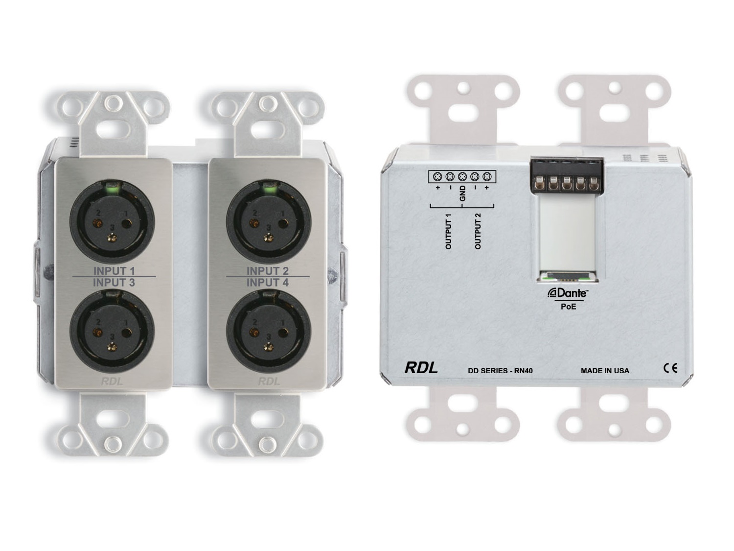 The DDS-RN40 is a complete wall-mounted Dante audio network interface. It features four XLR mic or line inputs on the front panels and two line outputs on a rear-panel detachable terminal block. The module is configured and adjusted using RDL CONSOLE or other network control software. The DDS-RN40 fits a standard US dual-gang electrical box or an RDL WB-2 back box for installations in thinner European or equivalent walls. The DDS-RN40 is PoE powered, and is available in multiple finishes with optional customized graphics.