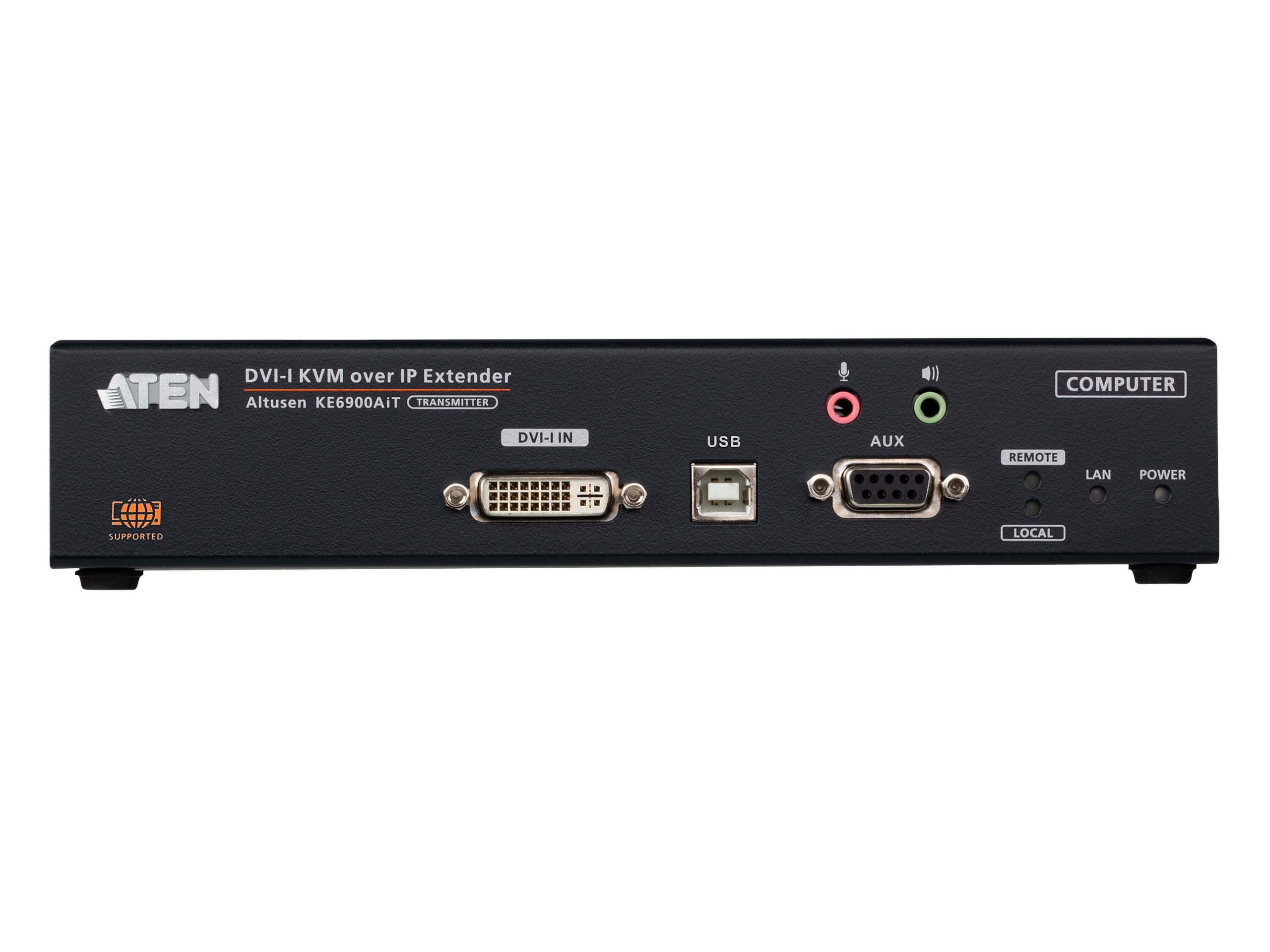 The KE6900AiT DVI-I Single Display KVM over IP Extender supports one DVI display at each end and provide lossless and low latency video transmissions up to 1920 x 1200 @ 60Hz.