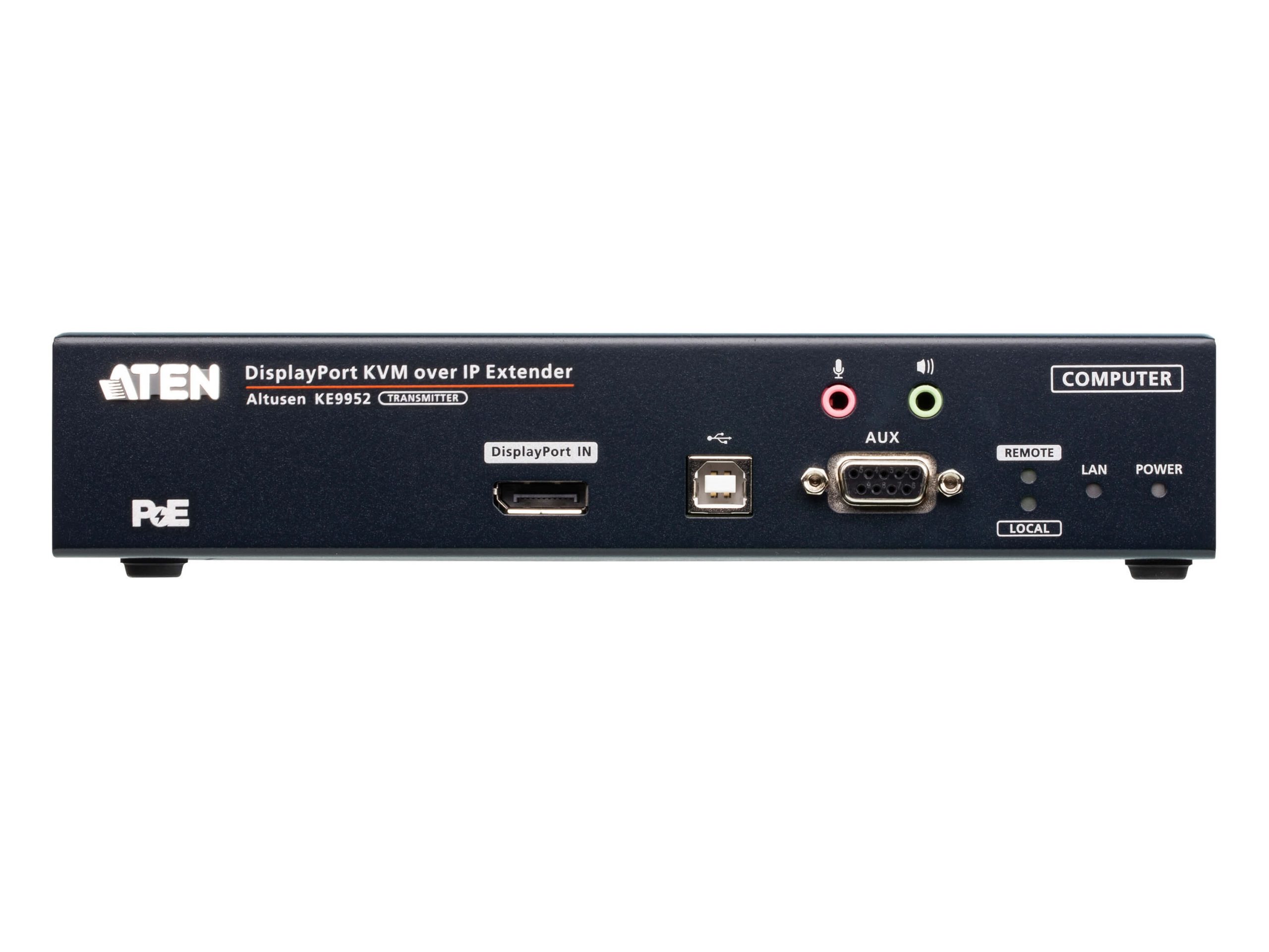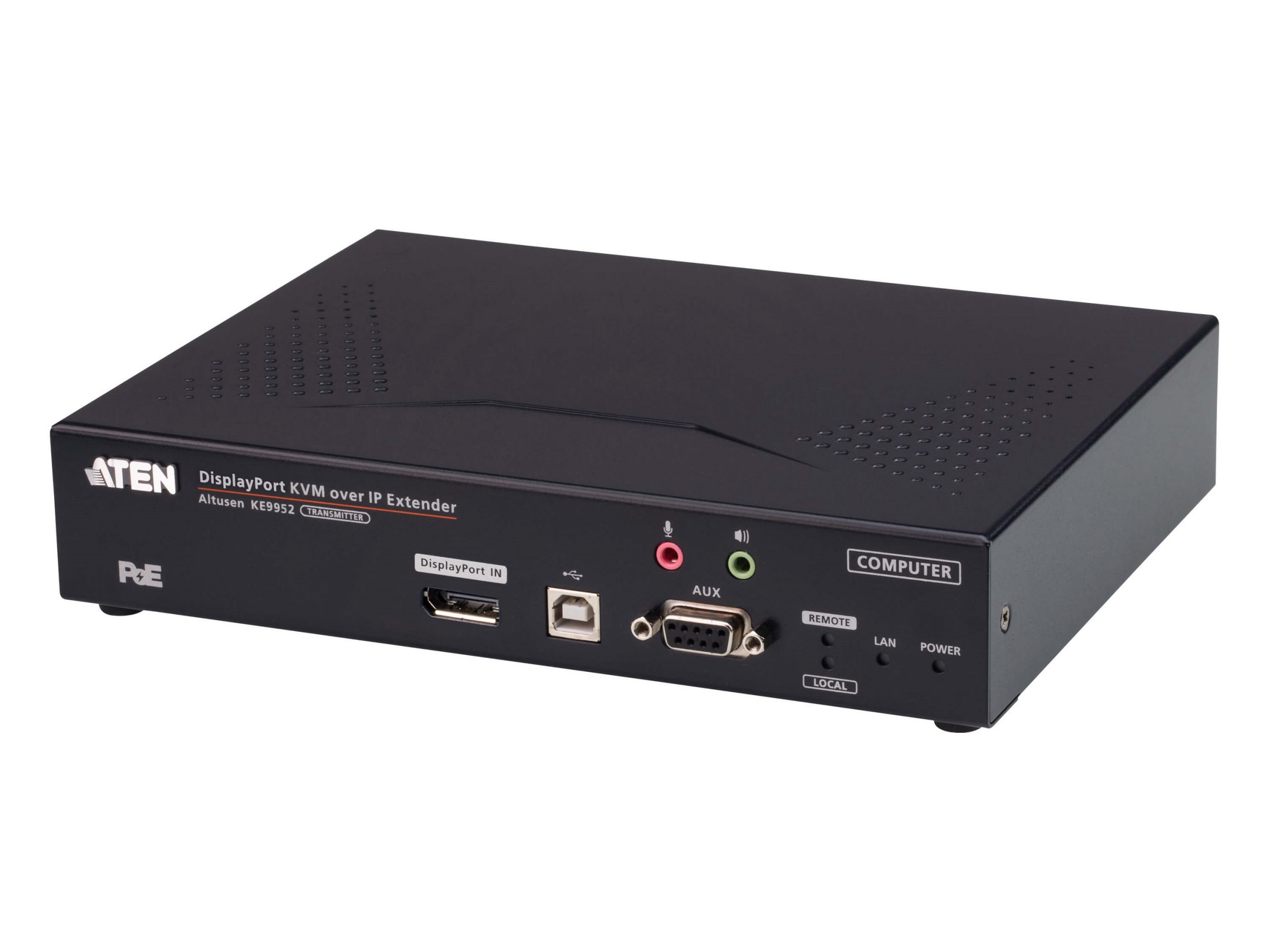 The KE9952 4K DisplayPort Single Display KVM over IP Extender consists of a high performance IP-based transmitter KE9952T that connects to the computer and receiver KE9952R that provides console access from a separate location. The KE9952 allows access to a computer system from a remote USB console (USB keyboard, USB mouse, DisplayPort monitor) over an intranet, enabling users to locate computers in a secure and temperature controlled environment, which is isolated from users’ workstation