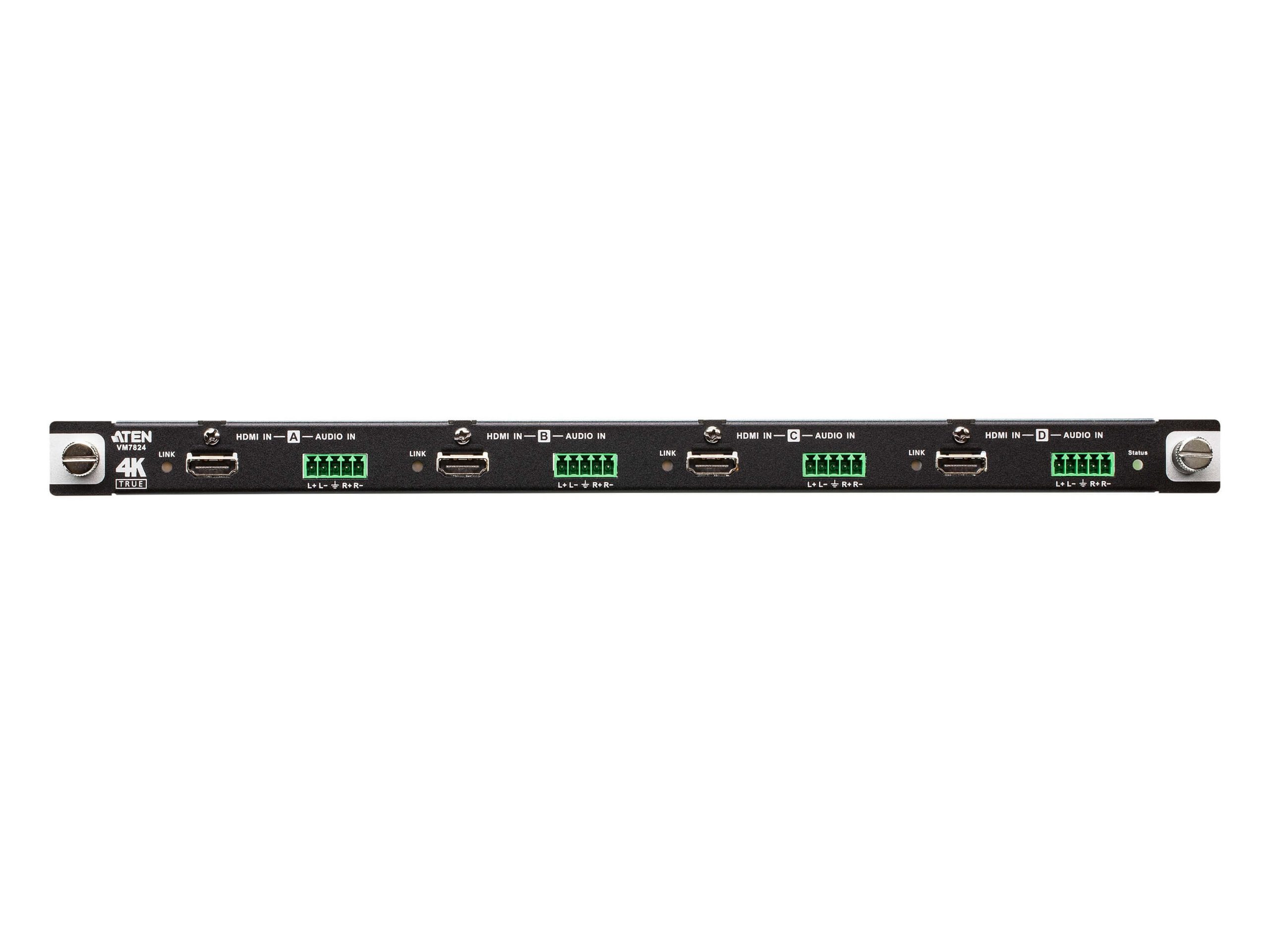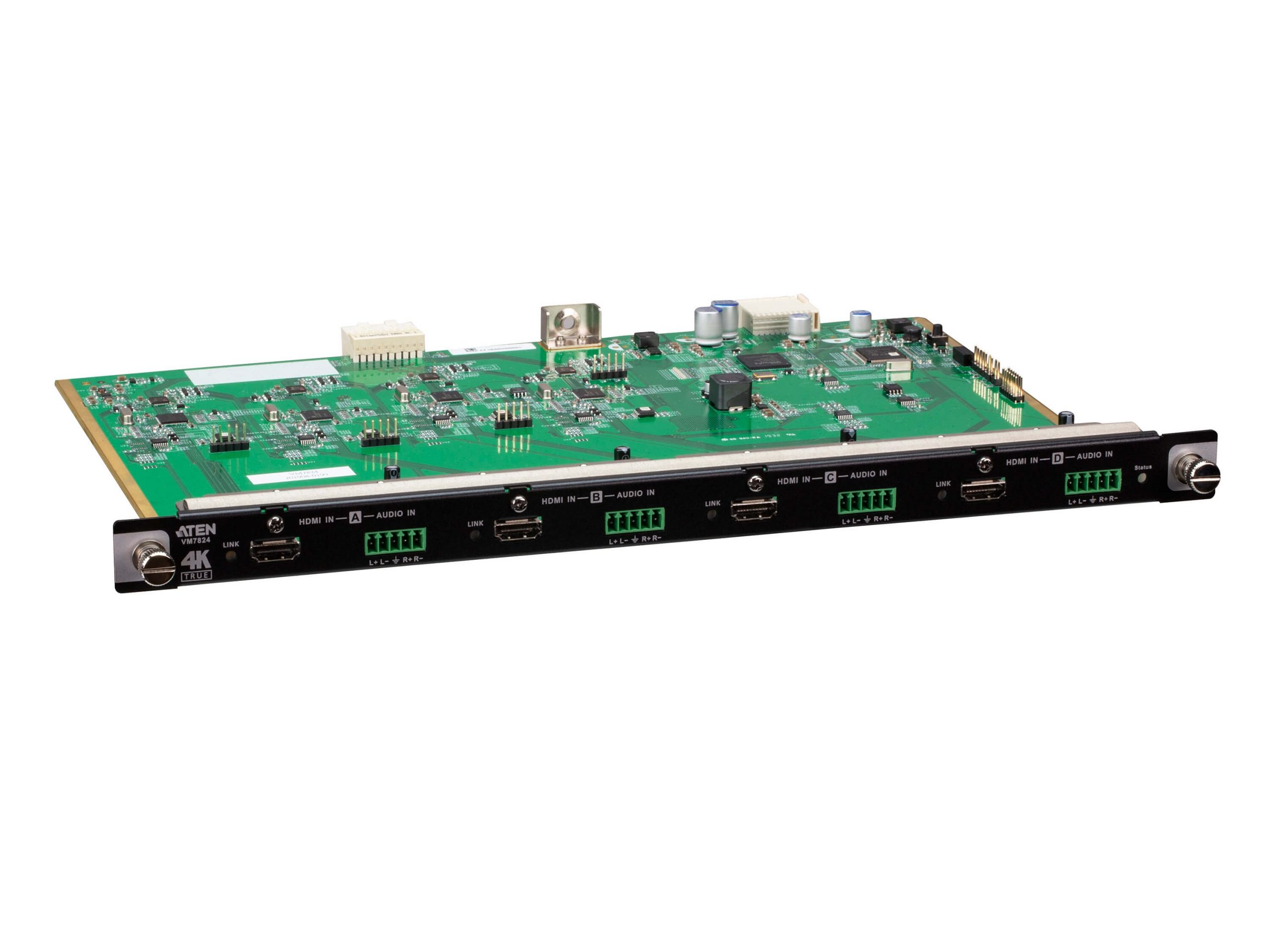 The VM7824 is a True 4K HDMI input board that works with an ATEN Modular Matrix Switch to offer an easy way to route 4 HDMI audio/video sources to 4 displays with True 4K high-definition images support. In addition to the HDMI interface that carries digital A/V signal, the VM7824 also provides 4 stereo audio input ports that enable stereo audio embedding.