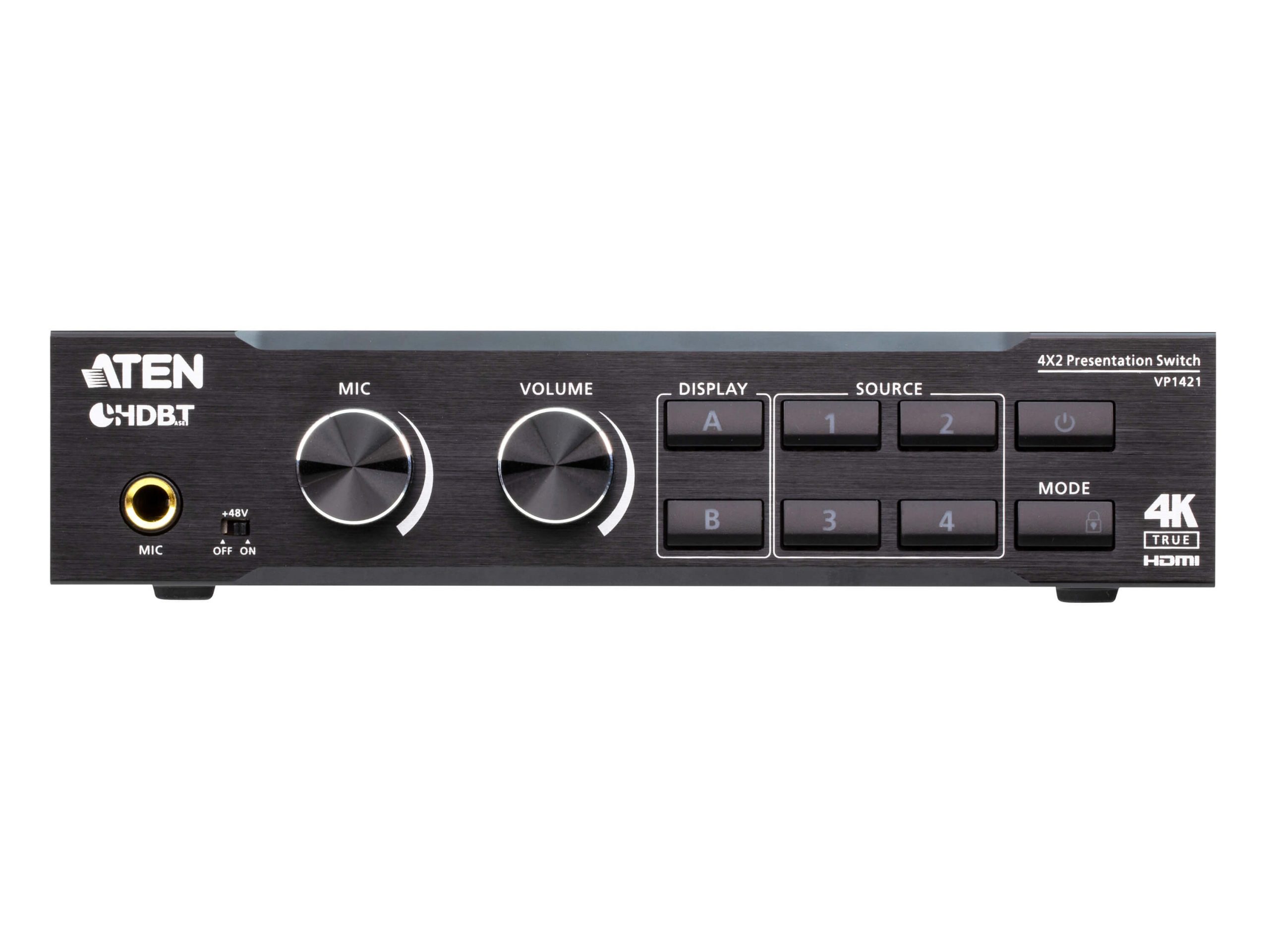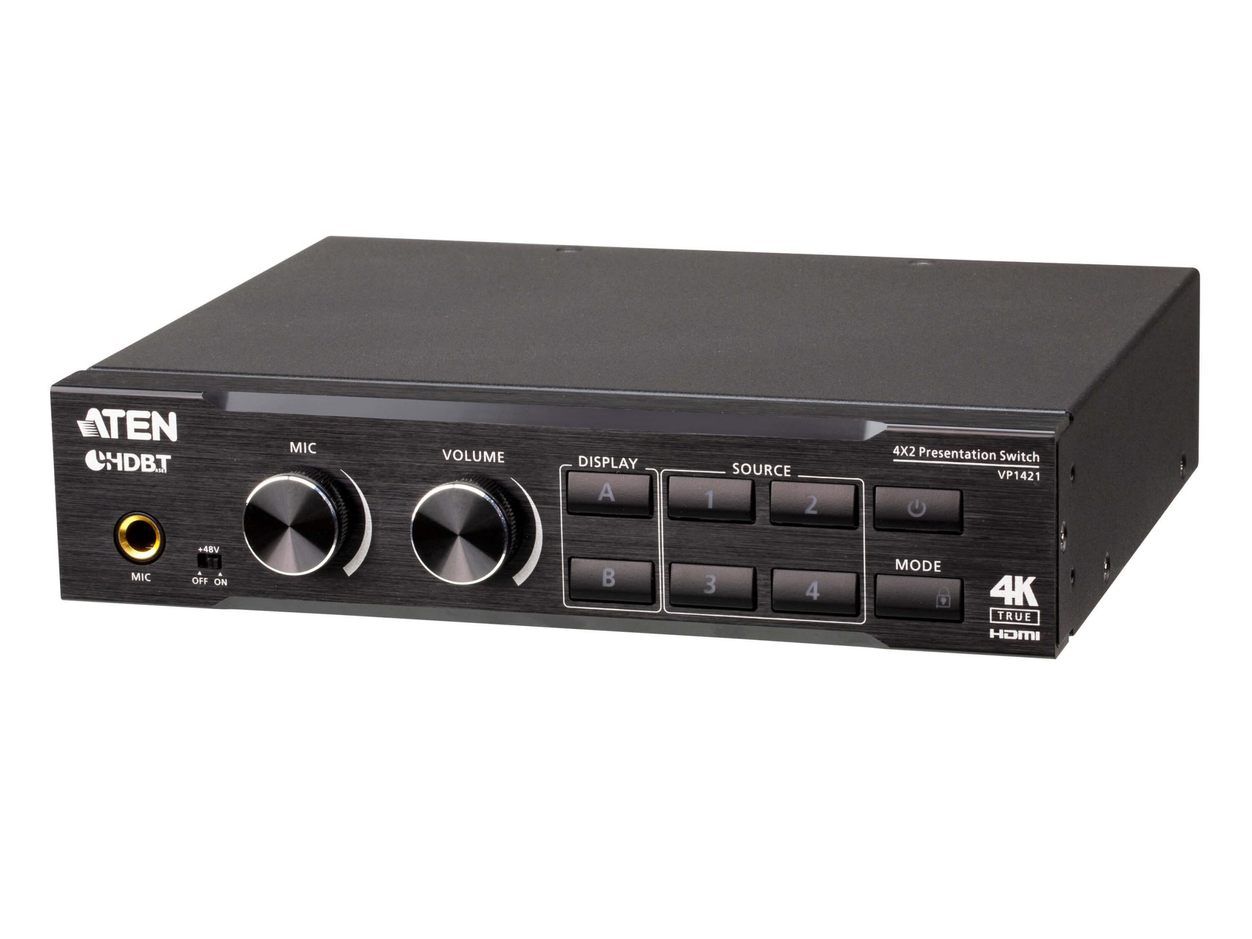 The VP1421 is a multi-in-one presentation switch that integrates a video matrix, True 4K scaler, HDBaseT extender, audio DSP, and analog-to-digital converter functions into a single compact enclosure, ideal for meeting rooms and educational spaces.