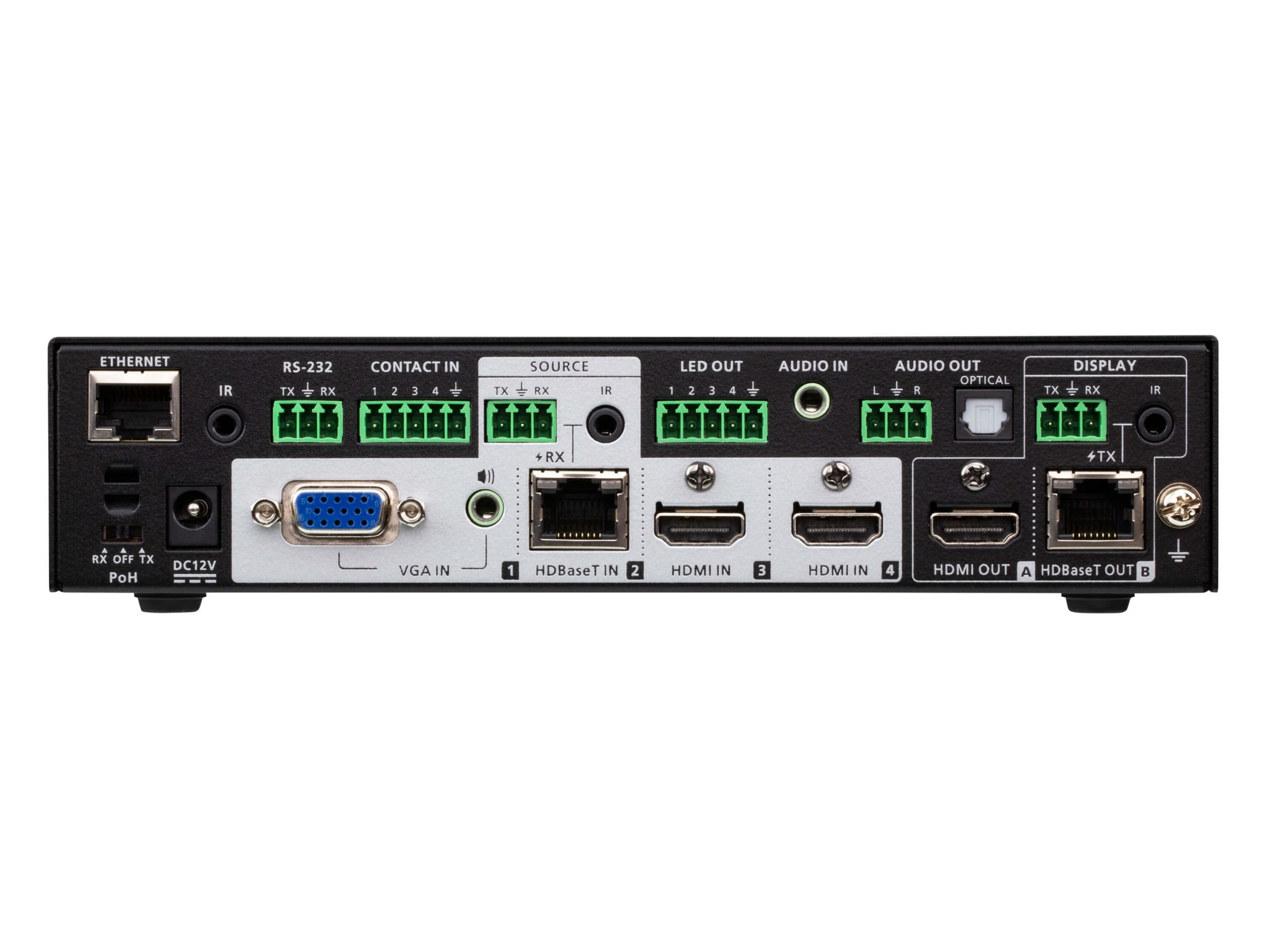 - Power over HDBaseT (POH) – remote powering over existing communication cable with selectable powering device