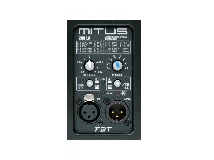 The FBT MITUS 206LA shall meet the following performance criteria: Frequency response of 68Hz to 20kHz, Maximum SPLof 134dB, class D amplifier module that provides 600W RMS to the LF and 300W RMS to the HF. The waveguide, optimized by BEM finite element simulation, offers 100° horizontal dispersion; engineered to be perfectly integrated with the HF compression driver it allows the dispersion of a flat acoustic wave to over 18kHz. The MITUS 206LAcabinets coupling hardware is internally integrated and allows the suspension of 12 arrays with a 10:1 safety factor. The front shall be protected by a heavy duty metal grille with anti-resonance spacers and exclusive synthetic cloth to protect the drivers. The FBT MITUS 206LA provides a wide range of hardware accessories for flying and ground stacked configurations.