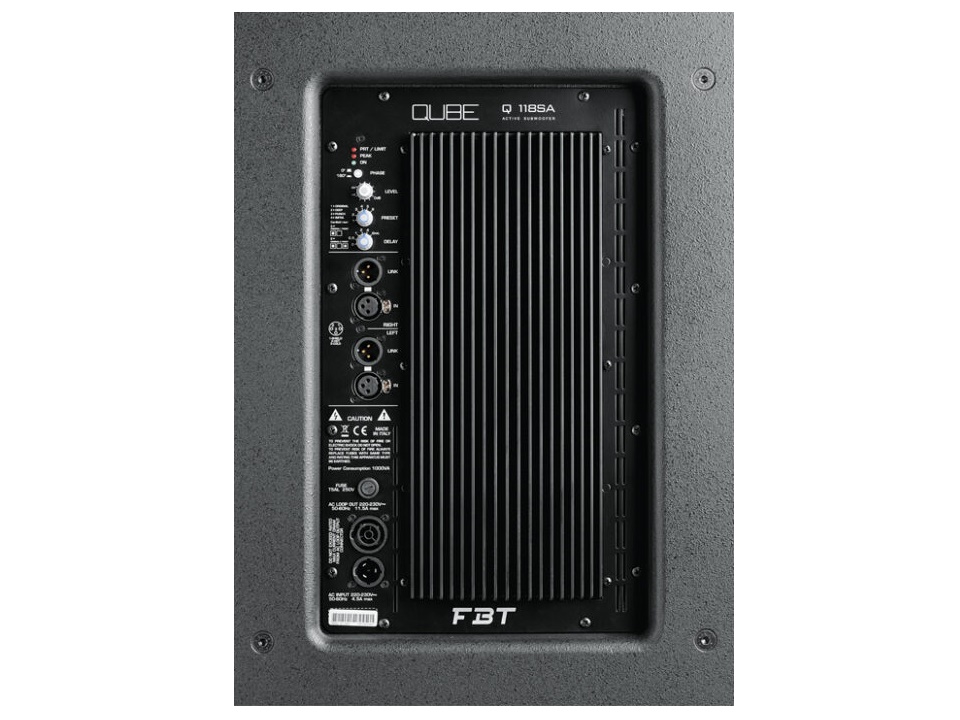 The Q118SA is a newly designed, extremely powerful subwoofer, capable of delivering extremely high SPL and guaranteeing significant low frequency extension. The optimisation of the woofer load volume and port tube with BEM finite element simulation, and the careful development of the grille and the protective fabric to minimise acoustic impedance, has led to a net improvement in performances as compared with previous models. Equipped with an high excursion ceramic B&C woofer with 100mm ventilated coil, it has negligible power compression, ensuring maximum acoustic pressure even after hours of continuous use.