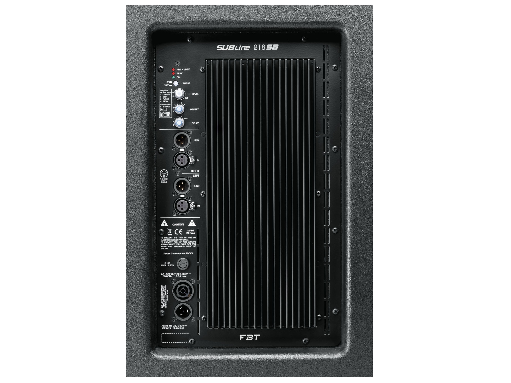 The FBT SUBLINE 218SA, 2 x 18″ bass reflex design subwoofer, is the perfect low-frequency extension and the ideal companion for the FBT MUSE 210L Aline array or ground stack applications with optional metal base. The FBT SUBLINE 218SA shall meet the following performance criteria: Frequency response of 30Hz to 120Hz, Maximum SPLof 140dB peak,Class D amplifier 1200W RMS. The FBTSUBLINE 218SAprovides a DSP with 6 presets-cardioid and infra configurations. The FBT SUBLINE 218SA feature 0.70″ Baltic birch plywood construction covered in a scratch resistant black paint with 2 x M20 top-mounted stand adapter and four FBT design aluminium handles. The control panel provides stereo XLR in &out, volume control, preset, delay, phase 0°-180°, 3 status led indicators.