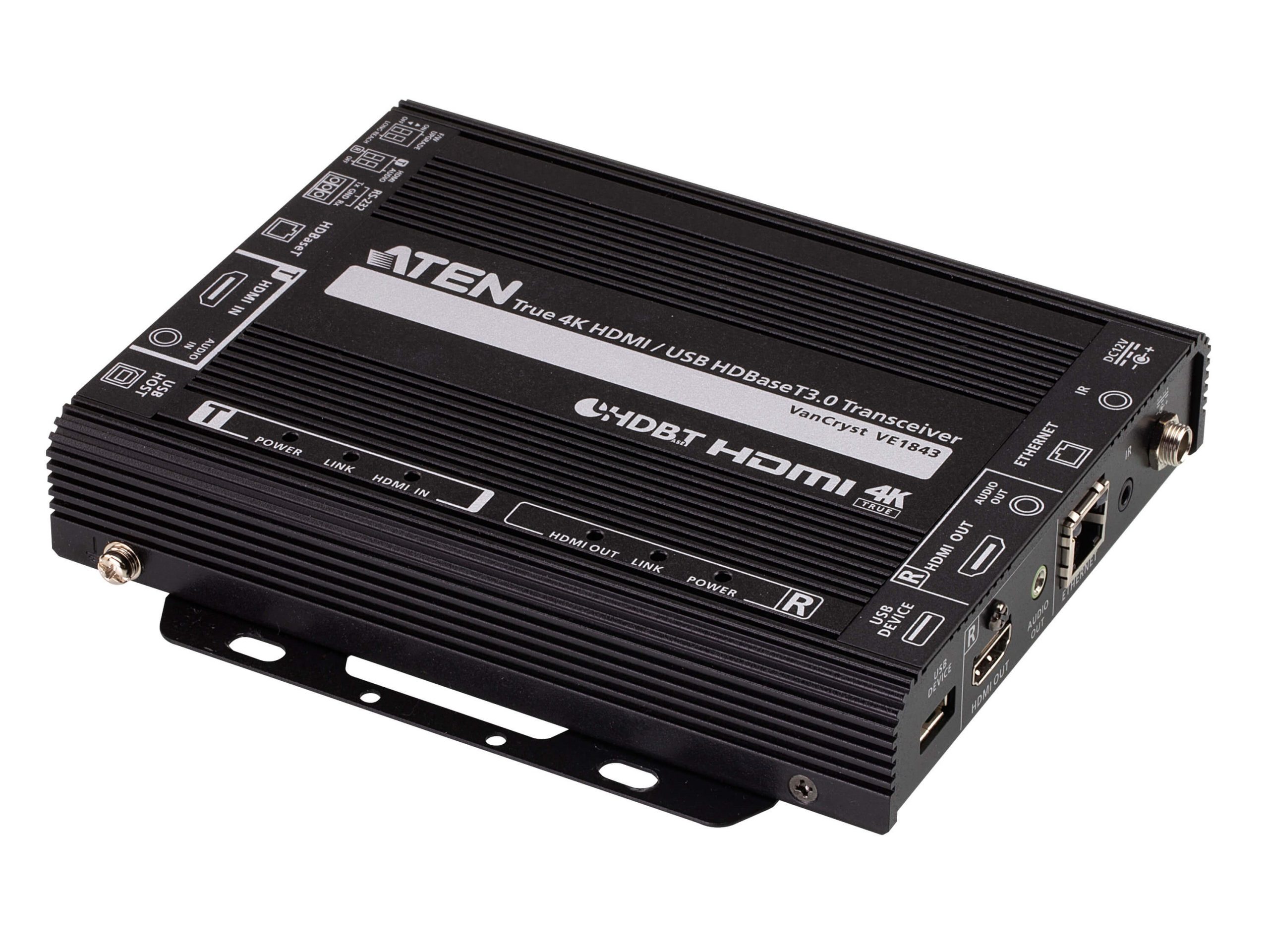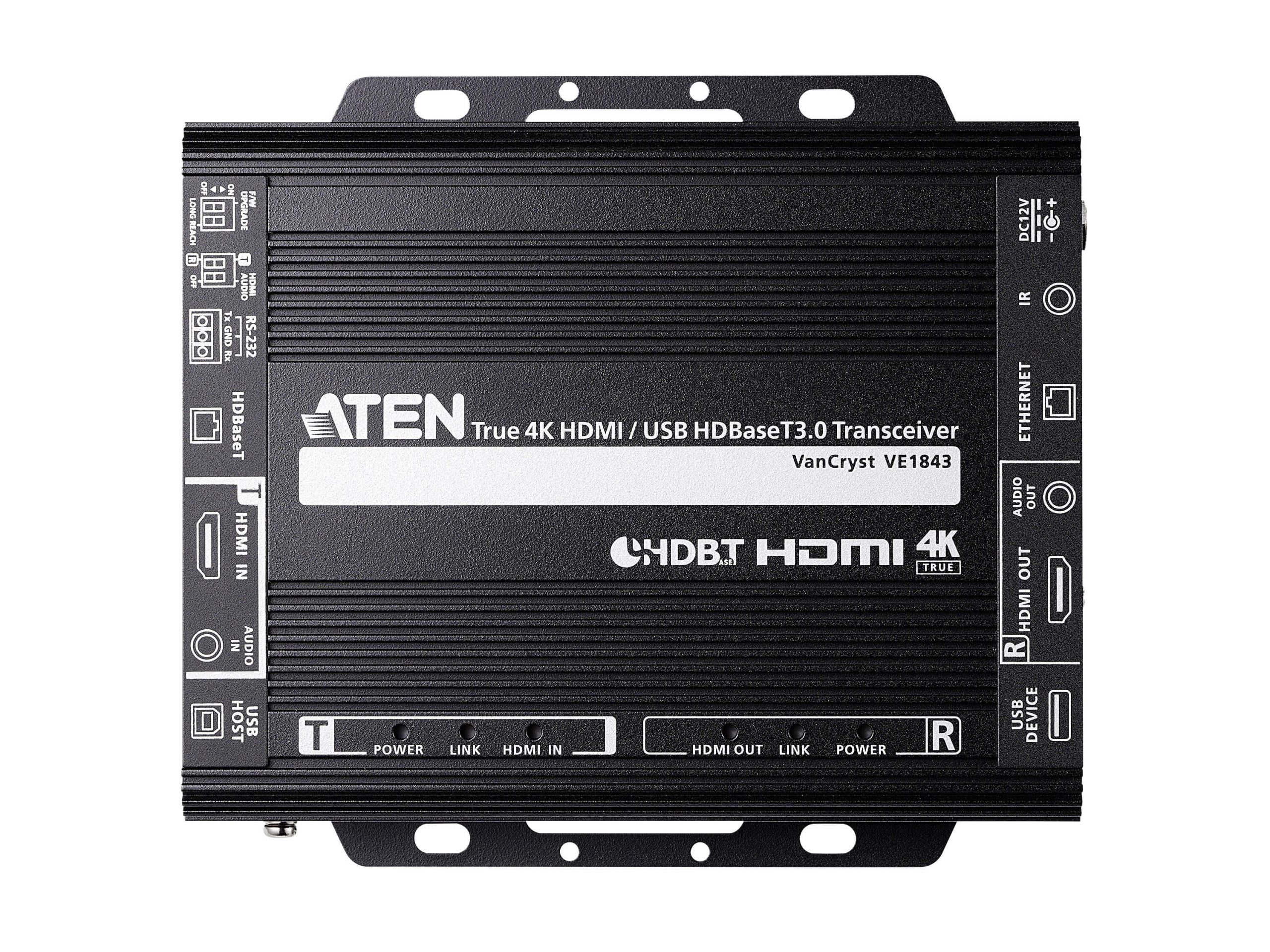 The VE1843 is ATEN’s first video transceiver and integrates the functions of a transmitter and a receiver into one unit. This combination allows users to easily configure the unit to be a transmitter or receiver depending on their AV solution, and to enjoy more flexible deployment and effective use with video matrix switches, video splitters, etc.