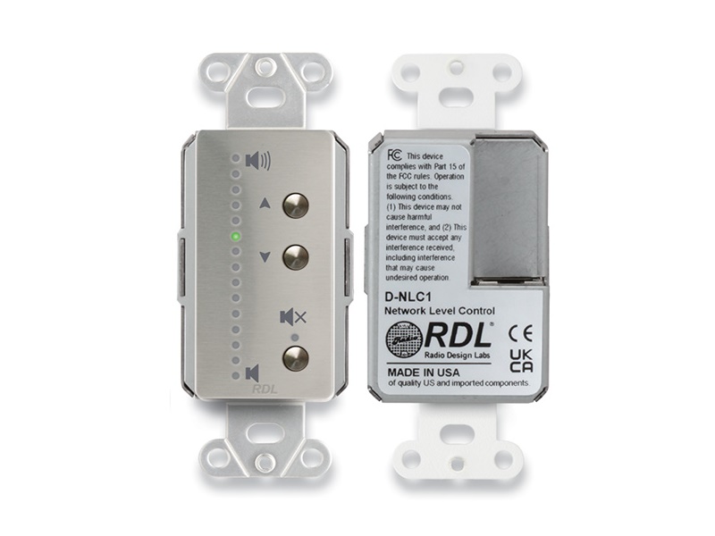 The D SERIES-NLC1 is a remote control that provides volume control at single or multiple locations. The -NLC1 connects to a digital network that may include compatible RDL audio and control modules as well as Dante devices from RDL and other manufacturers. Level is displayed on a 15 segment LED string. Each -NLC1 operates as a Controller or Satellite control permitting up to eight units to work together to adjust levels. Setup is accomplished in a web-browser session hosted by the -NLC1.