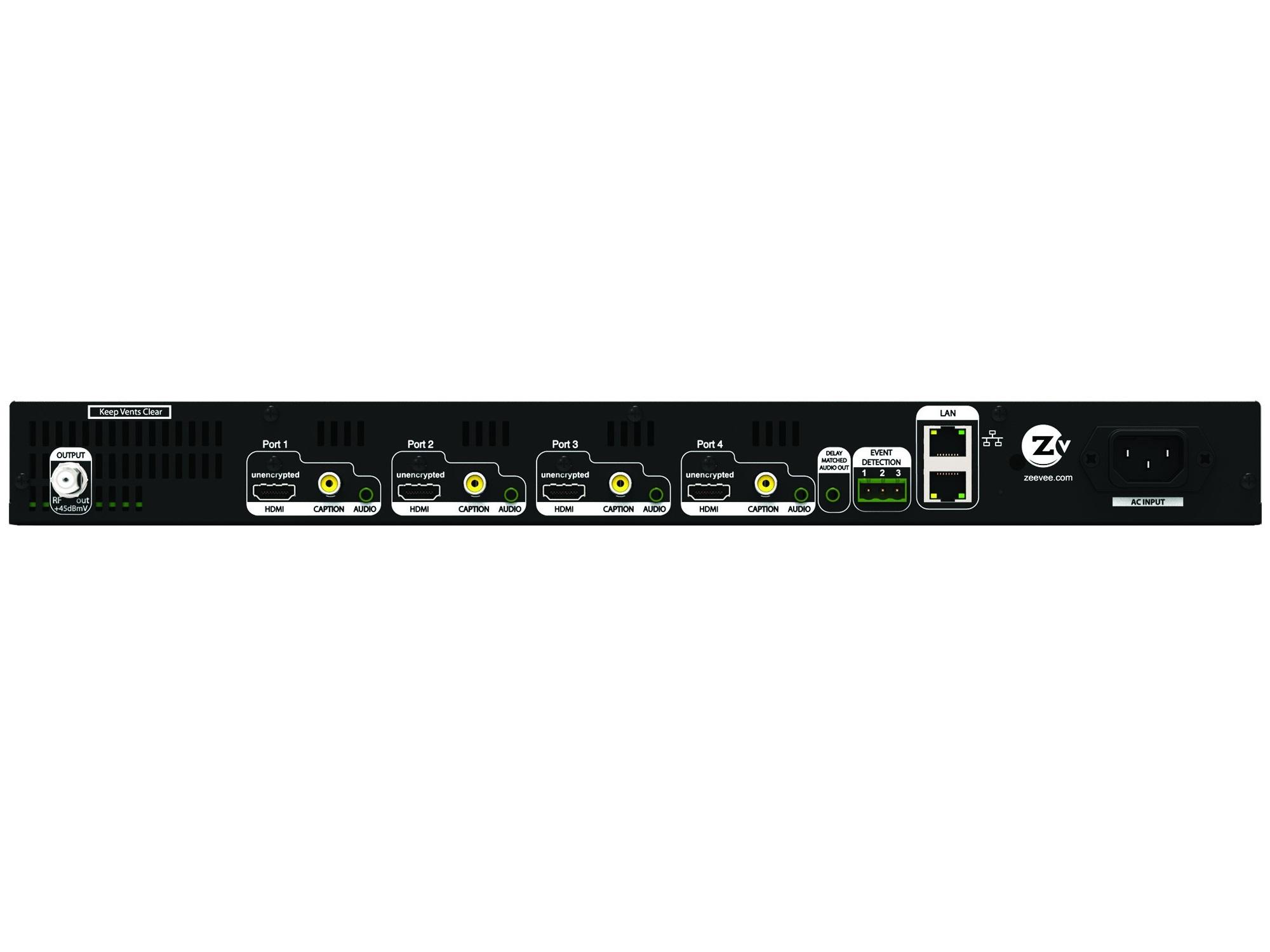 ZeeVee’s HDb2840 is a 4-channel HD modulator that produces a perfect video quality from unencrypted HDMI inputs. Included is a fifth bonus channel! Storing a MPEG-2 video file to the internal memory provides additional signage channel!