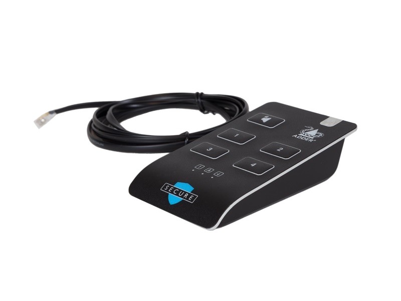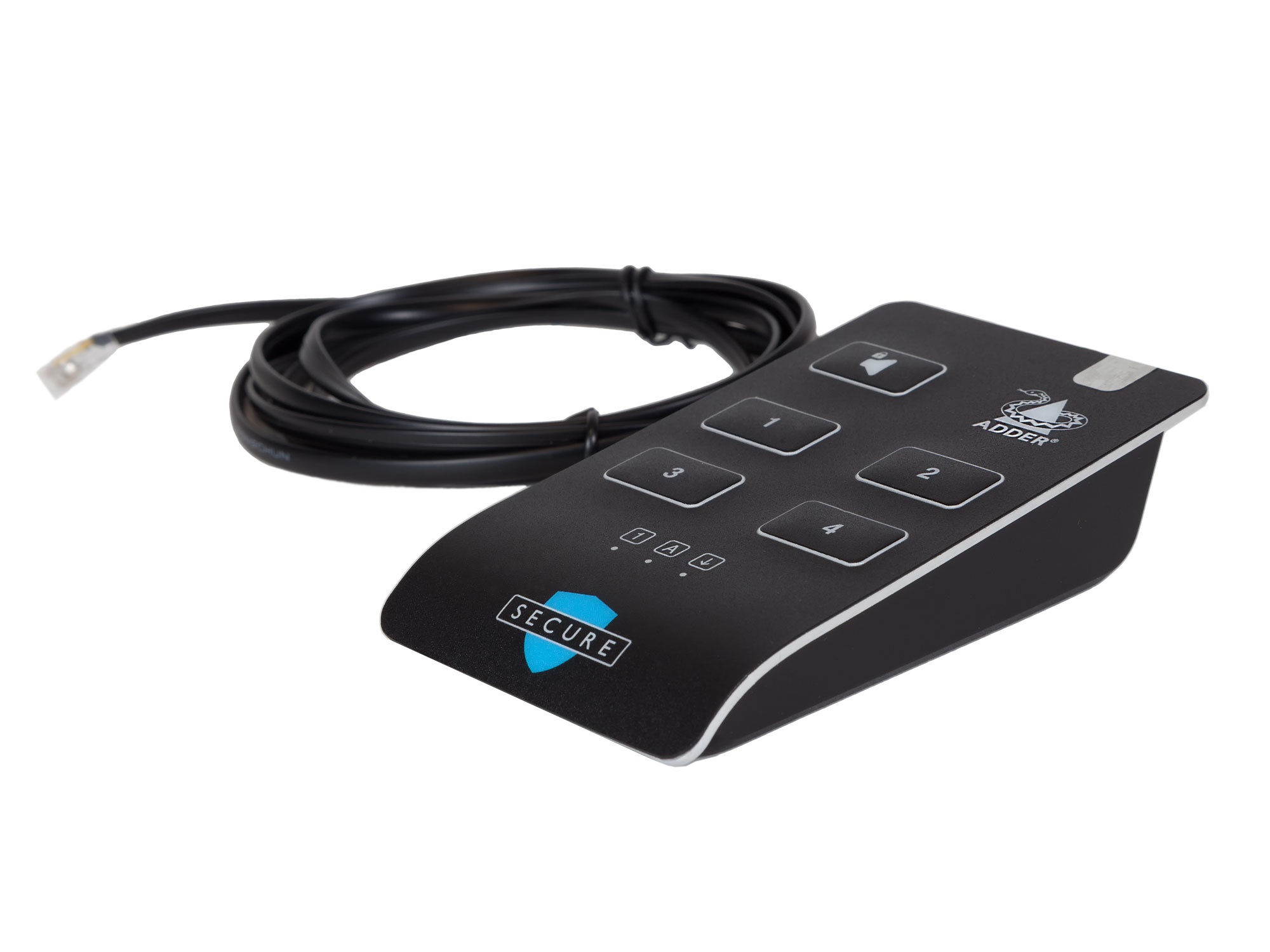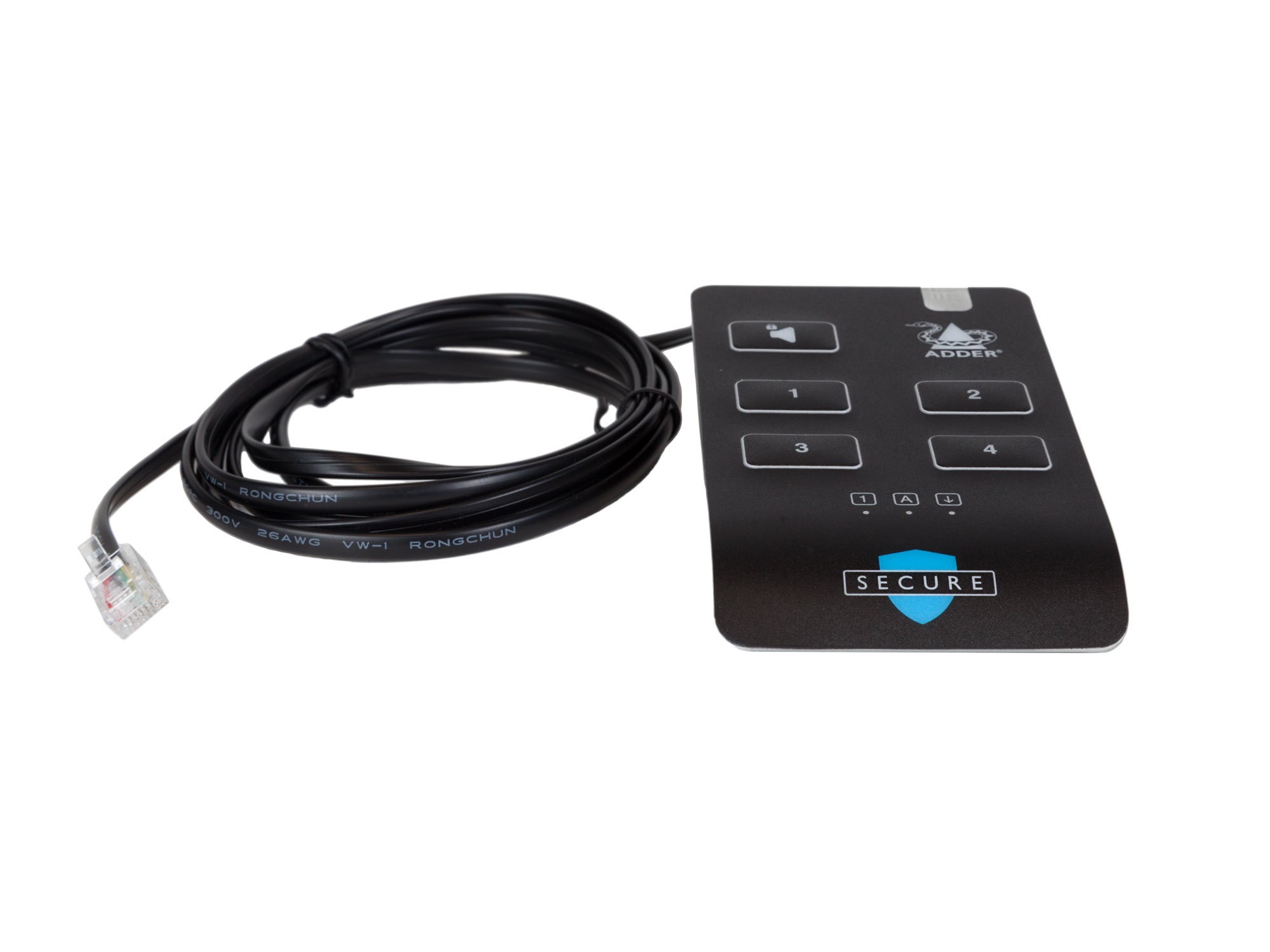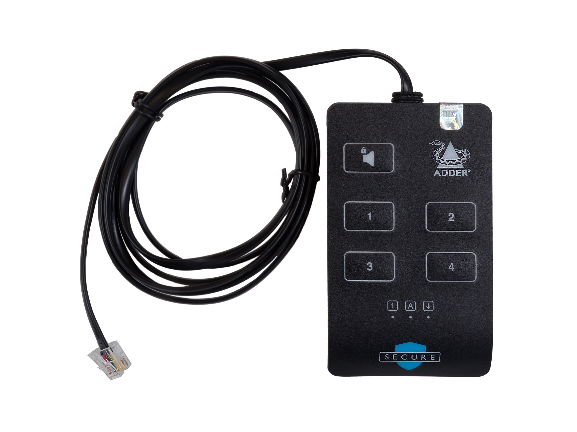 The ADDER Secure Remote Control Unit may be used to provide direct push-button access to any channel from your desktop. The unit is supplied with a serial cable for connecting to an ADDERView Secure switch.