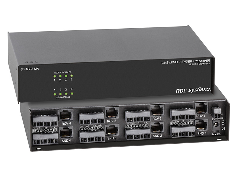 The SF-TPRS12A provides four audio receiving sections compatible with RDL Format-A twisted pair products. Each section receives up to three audio sources and provides three outputs corresponding to signal pairs A, B and C. A studio-quality buffer amplifier feeds +4 dBu balanced outputs through a detachable terminal block.