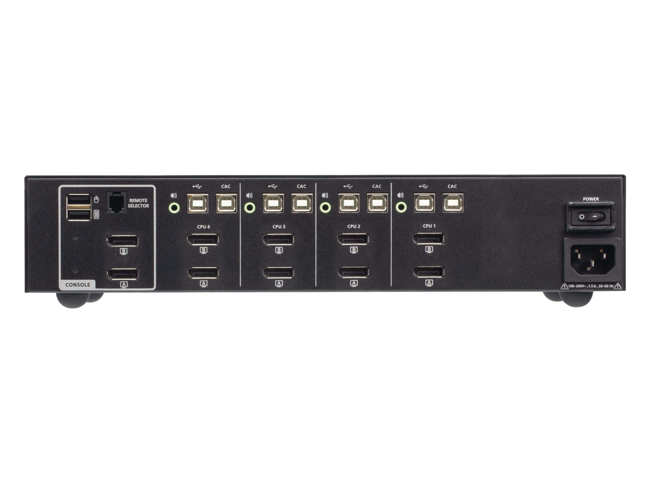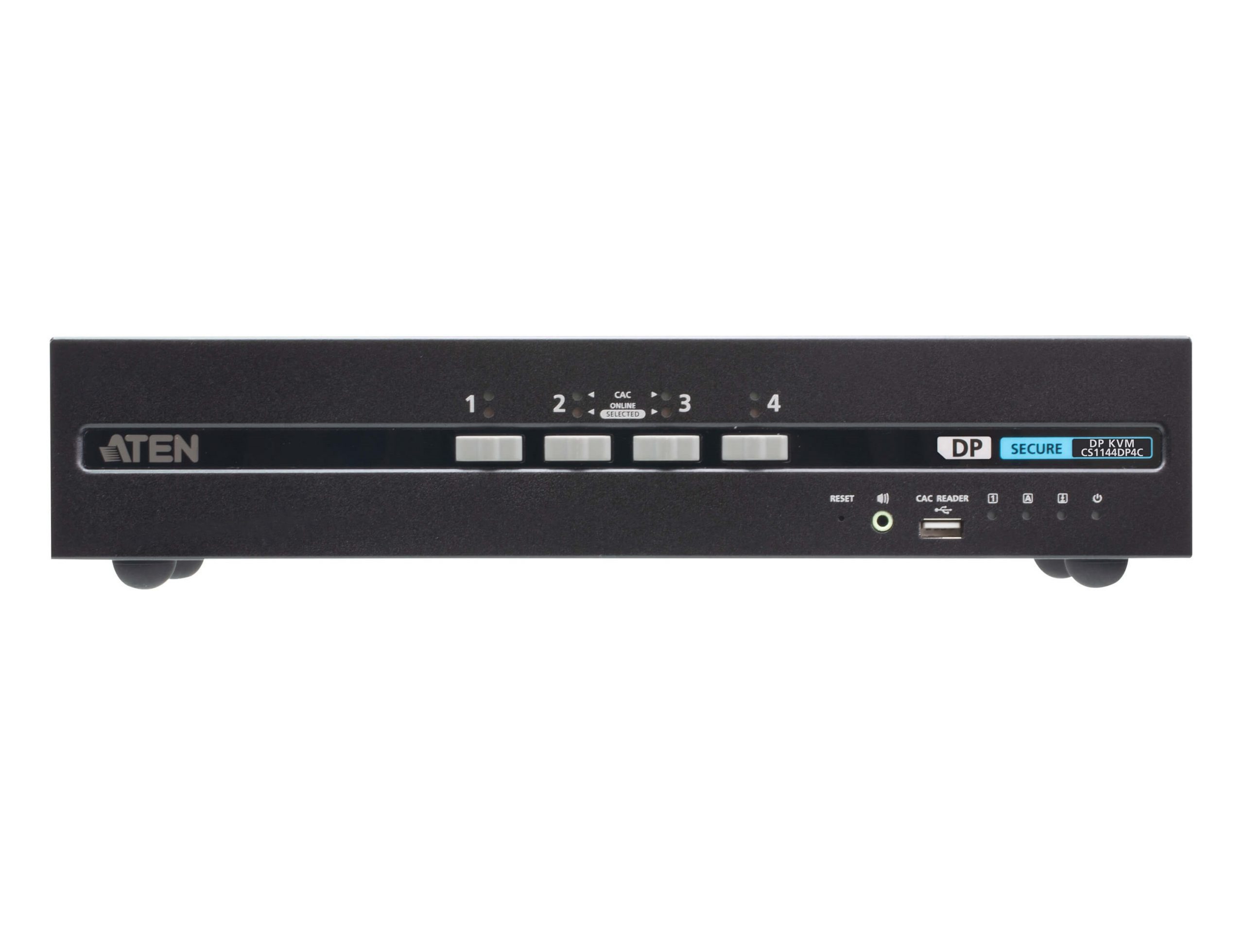 ATEN PSD PP v4.0 Secure KVM Switch CS1144DP4C provides isolation between computer sources and peripherals while sharing a single keyboard, mouse, monitor, speaker set, and Common Access Card (CAC) reader between connected computers of various security classifications. Compliance with PSD PP v4.0 ensures peripheral sharing capabilities provide maximum user data security when switching port focus, preventing unauthorized data flows or leakage between connected sources. Key protections include isolation and unidirectional data flow, restricted peripheral connectivity and filtering, user data protection, configurable device filtration and management, strict audio filtration, and always-on tamper-proof design, keeping sensitive assets isolated and providing advanced security and a user friendly design for instantly secure deployment.