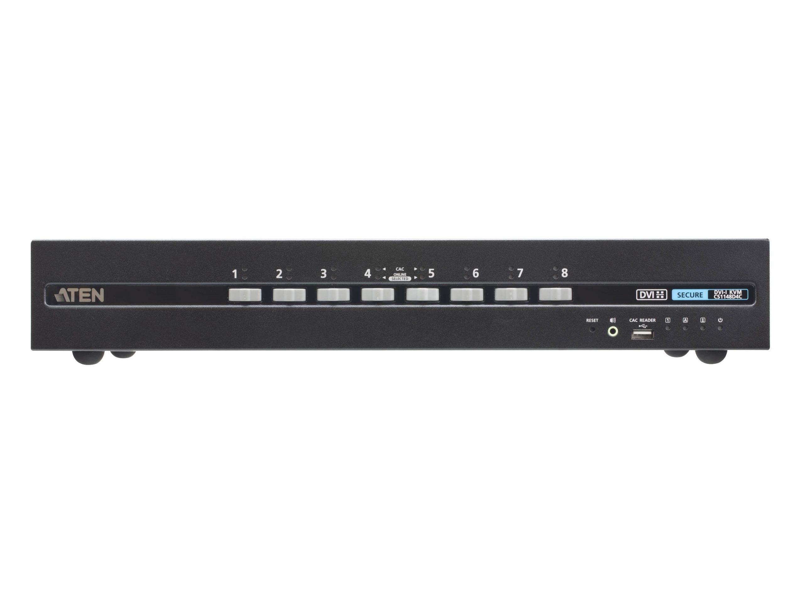 ATEN PSD PP v4.0 Secure KVM Switch CS1148D4C provides isolation between computer sources and peripherals while sharing a single keyboard, mouse, monitor, speaker set, and Common Access Card (CAC) reader between connected computers of various security classifications. Compliance with PSD PP v4.0 ensures peripheral sharing capabilities provide maximum user data security when switching port focus, preventing unauthorized data flows or leakage between connected sources. Key protections include isolation and unidirectional data flow, restricted peripheral connectivity and filtering, user data protection, configurable device filtration and management, strict audio filtration, and always-on tamper-proof design, keeping sensitive assets isolated and providing advanced security and a user friendly design for instantly secure deployment.