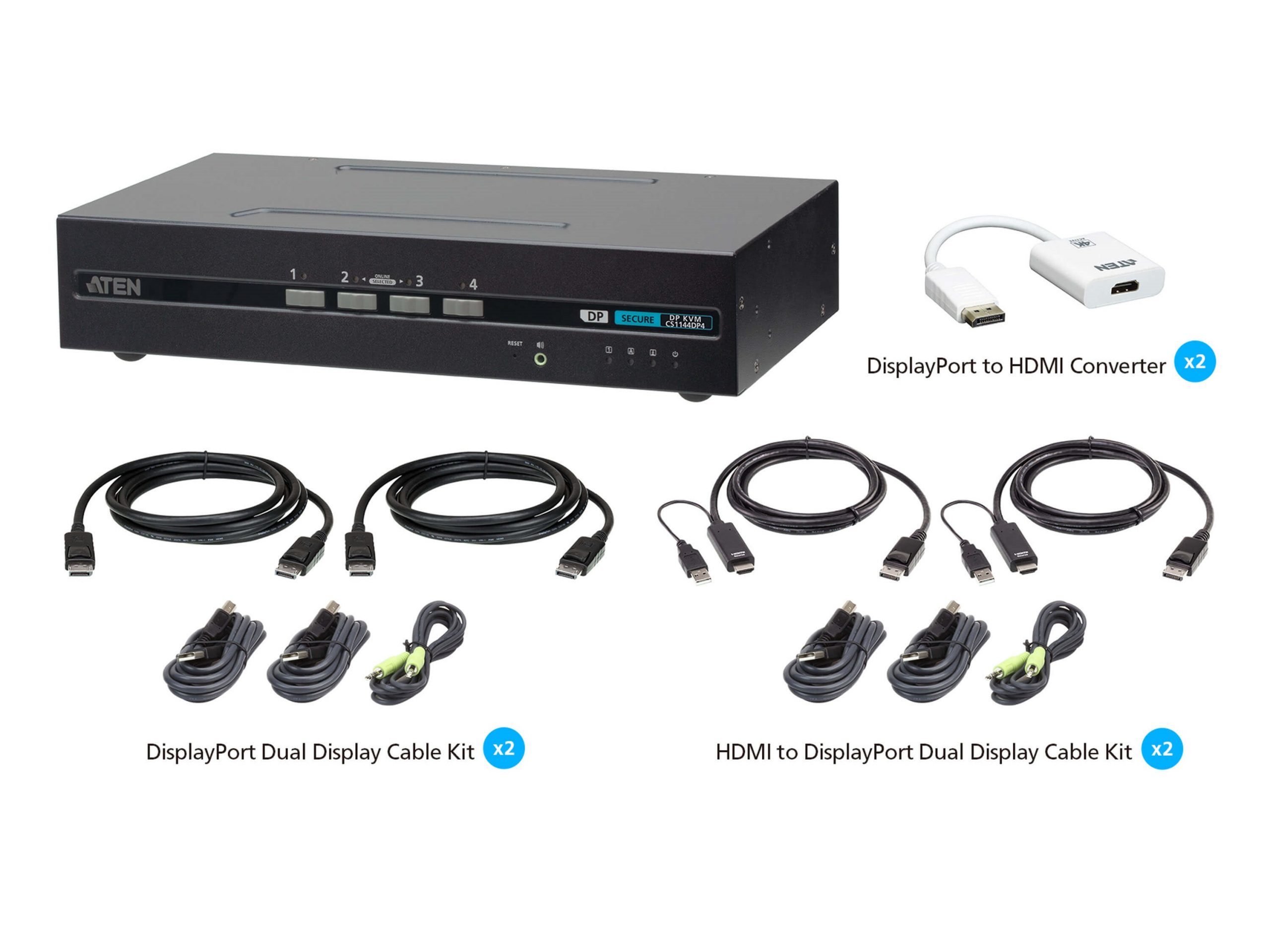 The ATEN CS1144DP4UN PSD PP v4.0 4-Port USB DisplayPort / HDMI Dual Display Universal Secure KVM Switch Kit contains one 4-Port USB DisplayPort Dual Display Secure KVM Switch CS1144DP4 plus corresponding adapter cables / converters, allowing IT managers to simultaneously connect computers / monitors with either DisplayPort or HDMI interface on the same KVM Switch for flexible deployment1. The Universal Secure KVM Switch Kit is an ideal solution that accommodates evolving technology changes and system upgrades. This future-proof solution not only enhances operating productivity, but also increases device deployment flexibility while supporting resolutions up to 4K UHD with the adapter cables / converters included in the package.