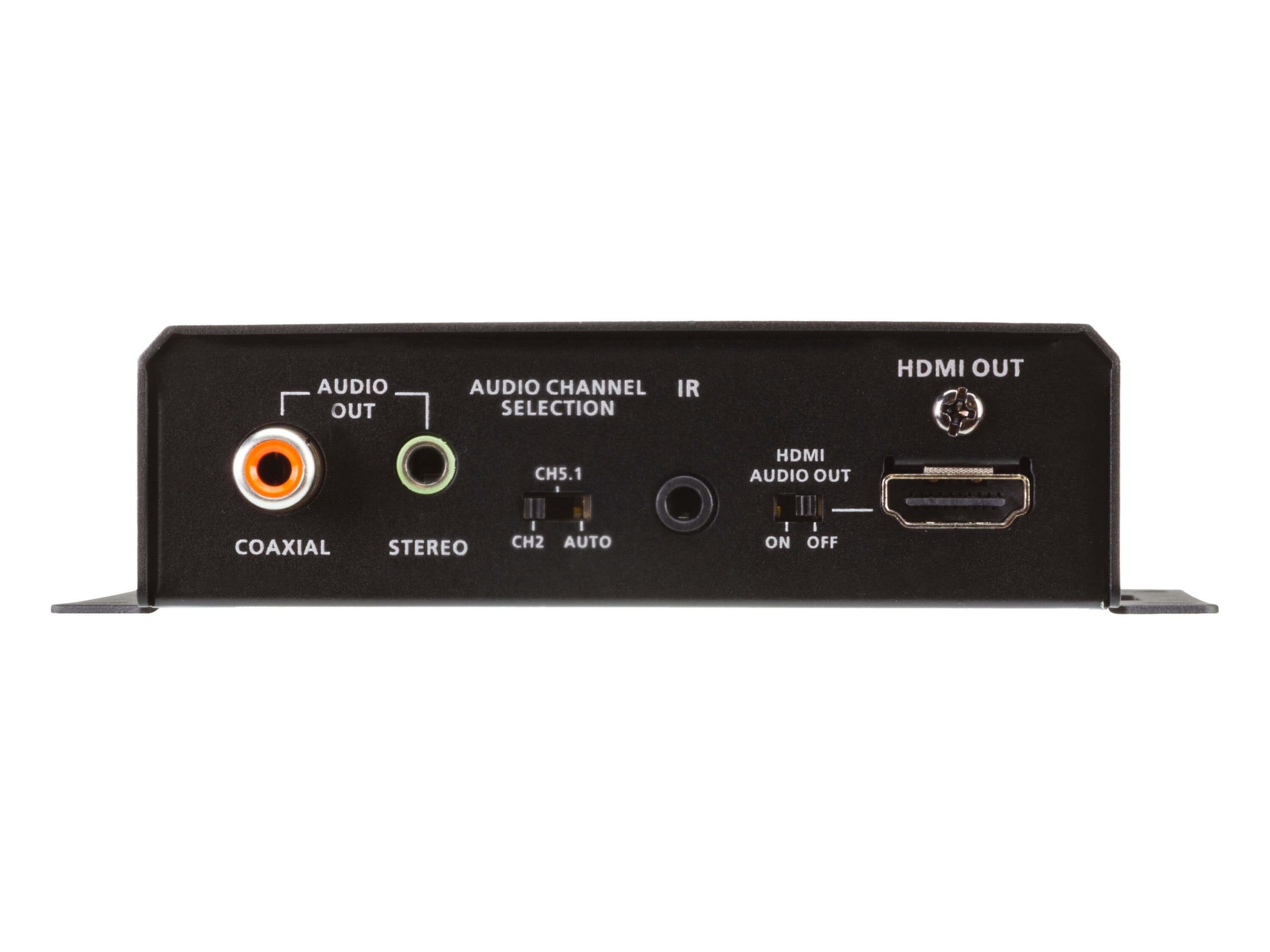 - Audio de-embedding – extracts audio stream from the HDMI source and delivers as a separate audio from HDMI to Coaxial S/PDIF, or Stereo audio output