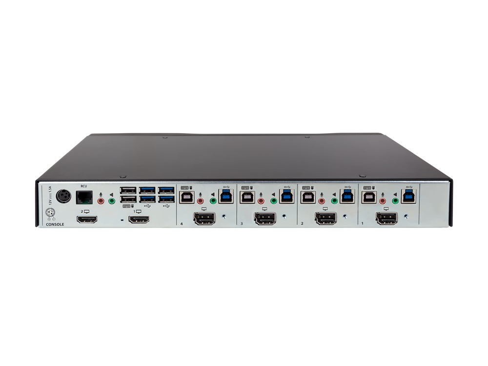 - Directly connect a single workstation to four video, audio and USB sources