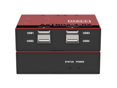 The HT-ASTRO2-4 is a 4-port plug-and-play USB2.0 extender via a single Cat5e/Cat6 cable. This extender hub kit transmits data from a PC to as many as four USB 2.0 peripherals up to 50m/165ft. The transmitter is powered by the USB port from the PC and the 4-port receiver is powered locally to provide access to keyboard, mouse, printers, scanners, cameras, speakers, external storage media, digital signage or automated control systems.