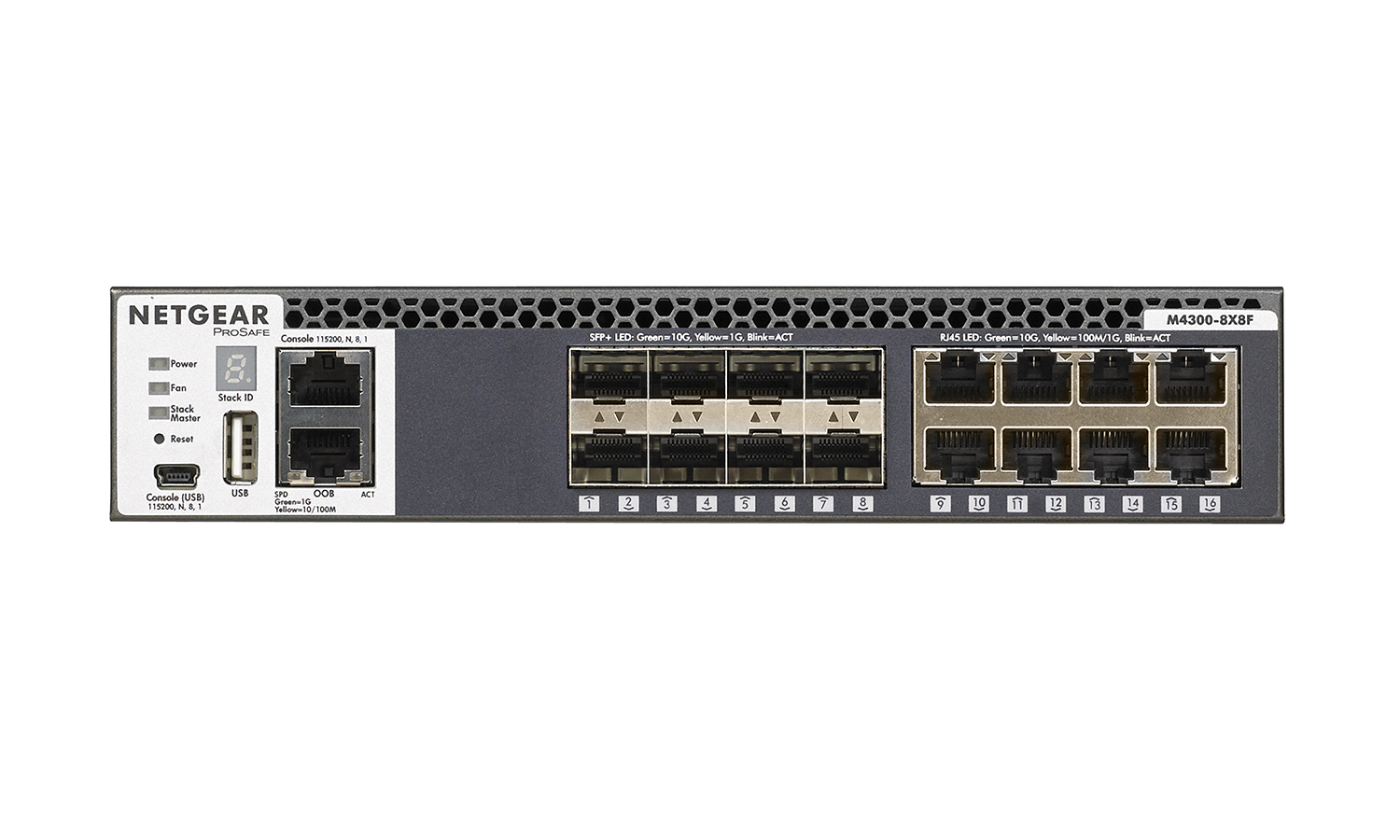 NET-M4300-8X8F-PC – Stackable Half-Width 16-Port Fully Managed Switch with 8x10GBase-T and 8xSFP+.